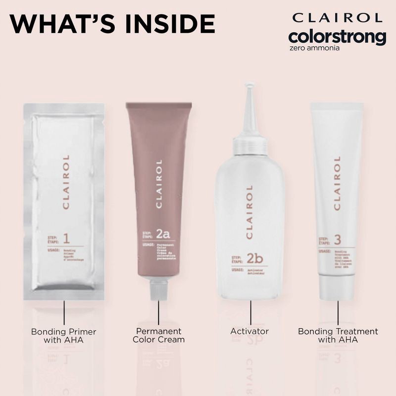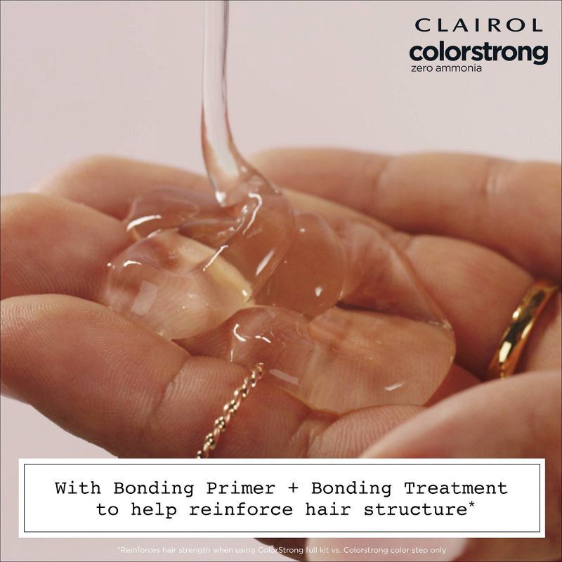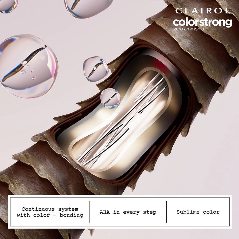 - TRANSPORT YOUR HAIR COLOR TO A NEW DIMENSION. Clairol ColorStrong gives you multidimensional color and reinforces the internal structure of your hair. What's the secret? The continuous system with color + bonding has AHA in every step: Bonding Primer, Permanent Color and Bonding Treatment. Zero ammonia + 100% gray coverage. Sublimely multidimensional color.