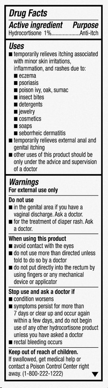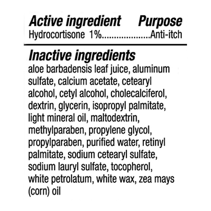 Active Ingredients: Hydrocortisone (1 %), Anti-Itch. Inactive Ingredients: Aloe Barbadensis Leaf Juice, Aluminum Sulfate, Calcium Acetate, Cetearyl Alcohol, Cetyl Alcohol, Cholecalciferol, Dextrin, Gl…