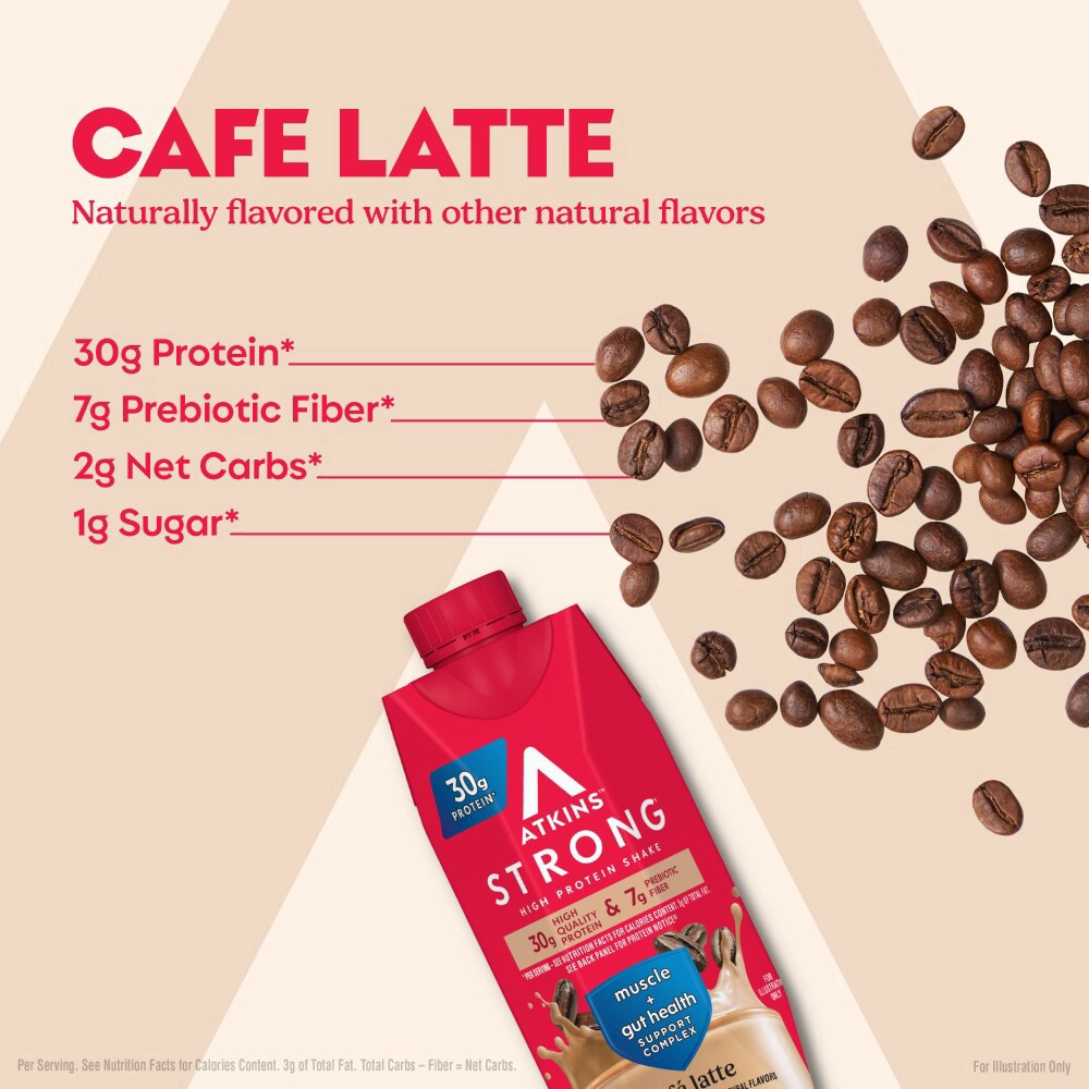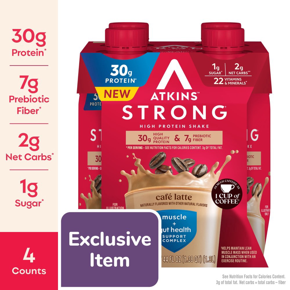 - PROTEIN-PACKED DECADENCE; Enjoy a deliciously smooth, rich brewed latte flavored Atkins Strong High Protein Shake packed with 30g of protein tohelp satisfy your hunger and your sweet tooth; The flavor you love, without a ton of sugar or carbs
