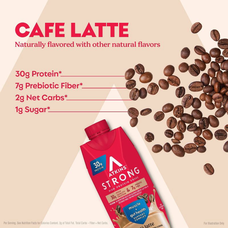 - PROTEIN-PACKED DECADENCE. Enjoy a deliciously smooth, rich brewed latte flavored Atkins Strong High Protein Shake packed with 30g of protein to help satisfy your hunger and your sweet tooth. The flavor you love, without a ton of sugar or carbs.