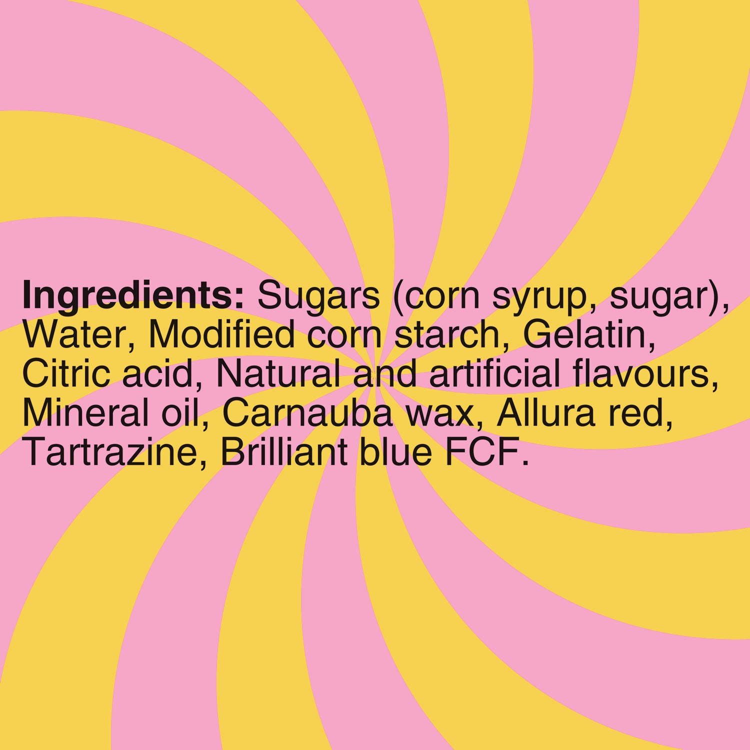 Corn Syrup, Sugar, Water, Apple Juice Concentrate, Modified Corn Starch, Gelatin; Less than 2% of: Citric Acid, Natural and Artificial Flavors, Mineral Oil, Colors (Red 40, Yellow 5, Blue 1), Carnauba…
