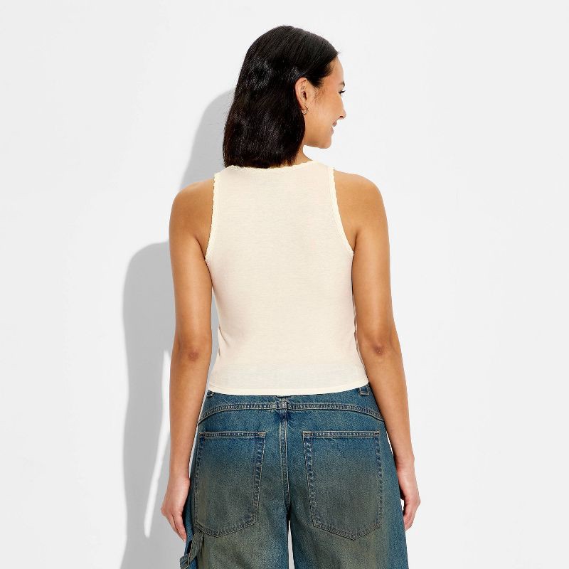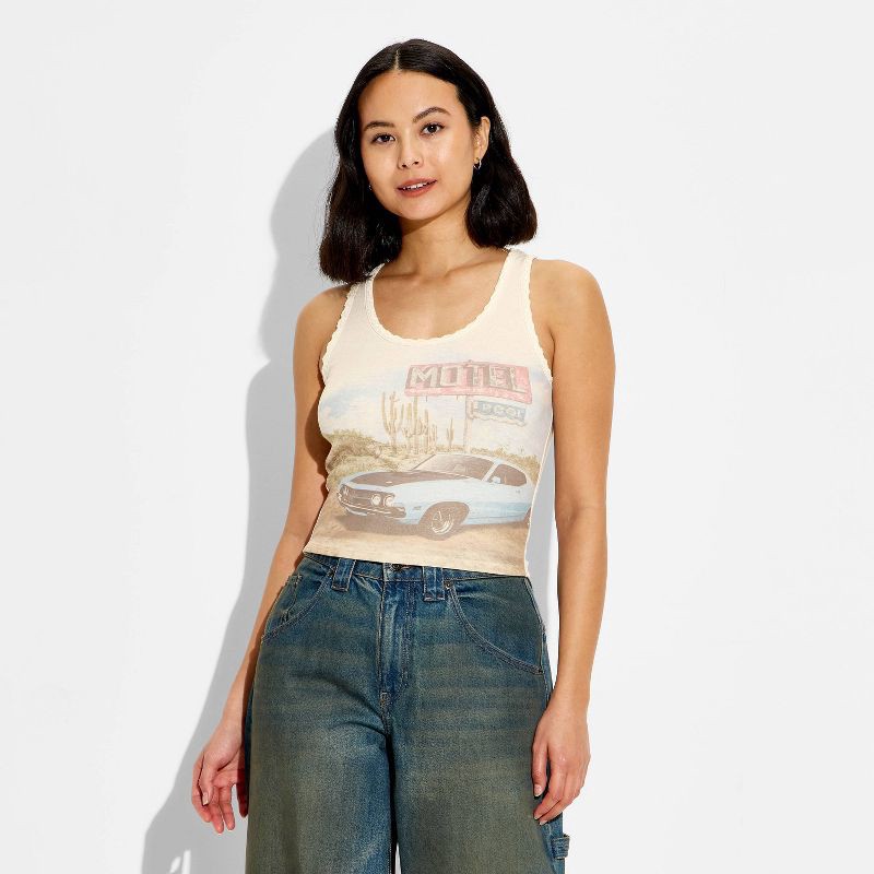 Shift your style into a new gear with this Ford Graphic Tank Top. This light beige tank top features a colorful vintage-style Ford graphic across the front, accompanied by scalloped lace-like detailin…