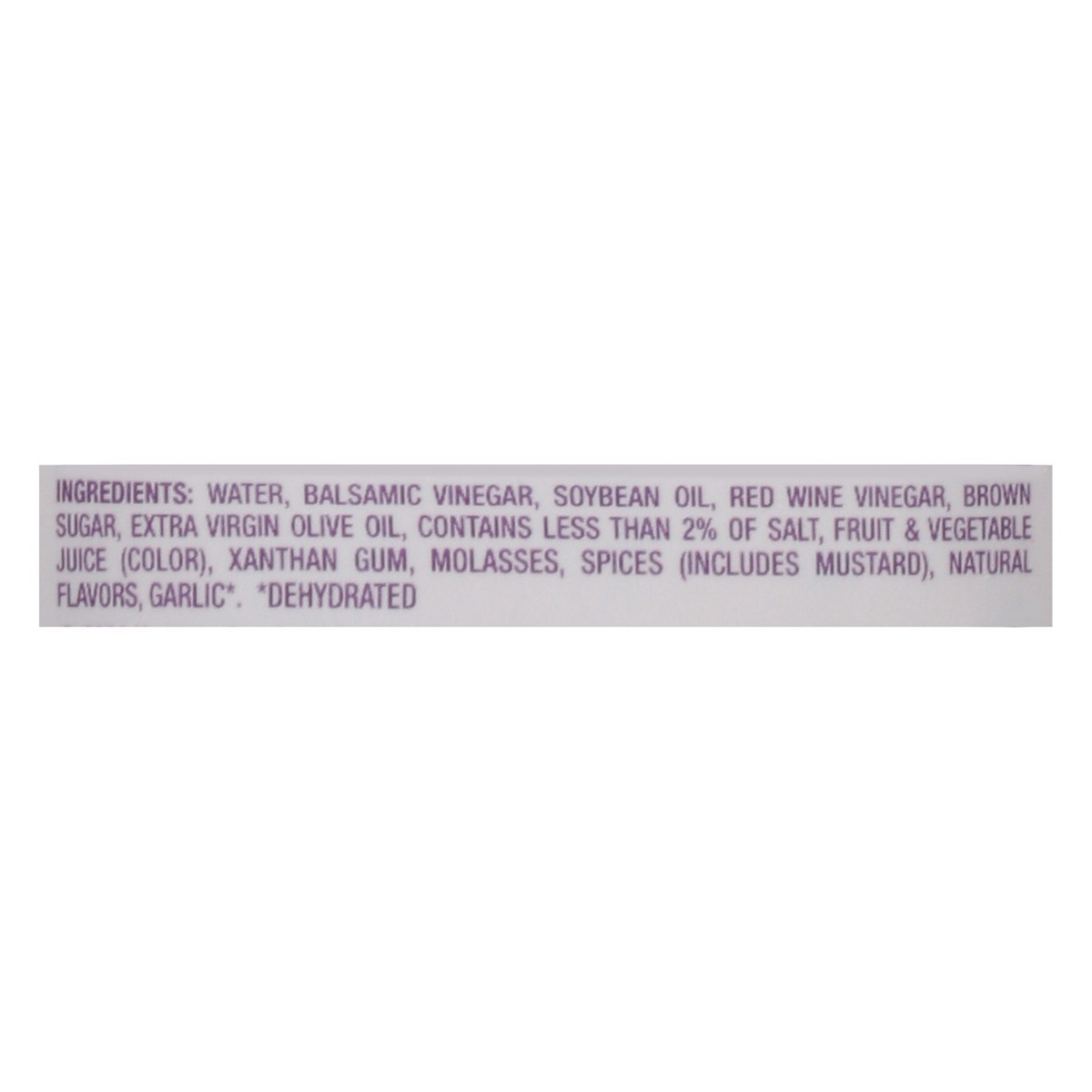 Water, Balsamic Vinegar, Soybean Oil, Red Wine Vinegar, Brown Sugar, Extra Virgin Olive Oil, Contains Less than 2% of Salt, Fruit & Vegetable Juice (Color), Xanthan Gum, Molasses, Spices (Includes Mus…
