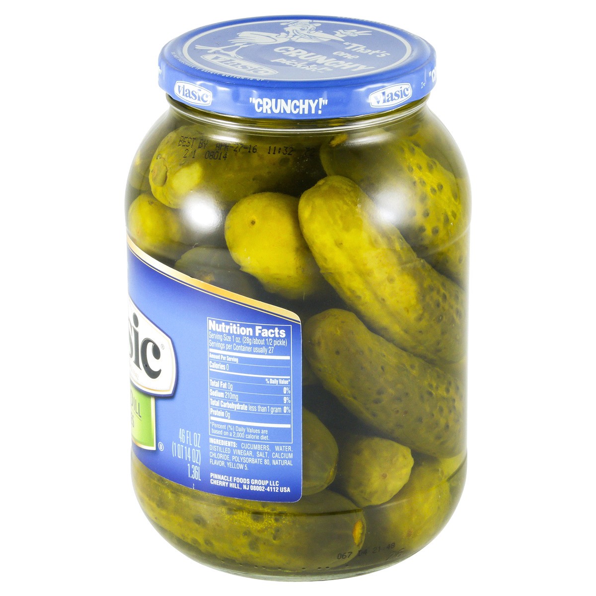 Vlasic Kosher Dill Whole Pickles are deliciously crunchy. All ingredients, along with the Vlasic secret pickling recipe, make these Kosher dill pickles tasty. These snack pickles contain 0 calories pe…