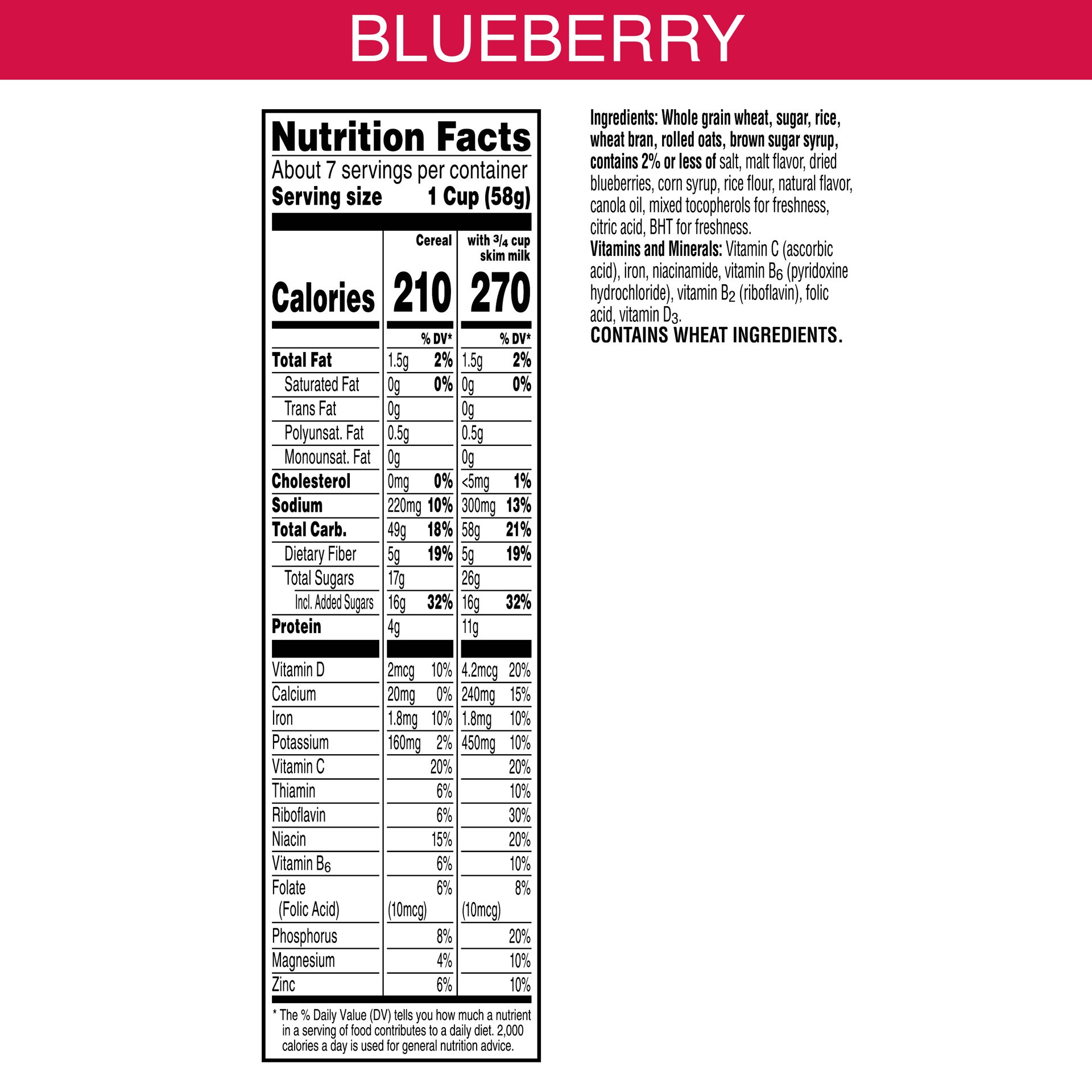 Whole Grain Wheat, Sugar, Rice, Wheat Bran, Rolled Oats, Brown Sugar Syrup, Contains 2% or Less of Salt, Malt Flavor, Dried Blueberries, Corn Syrup, Rice Flour, Natural Flavor, Canola Oil, Mixed Tocop…