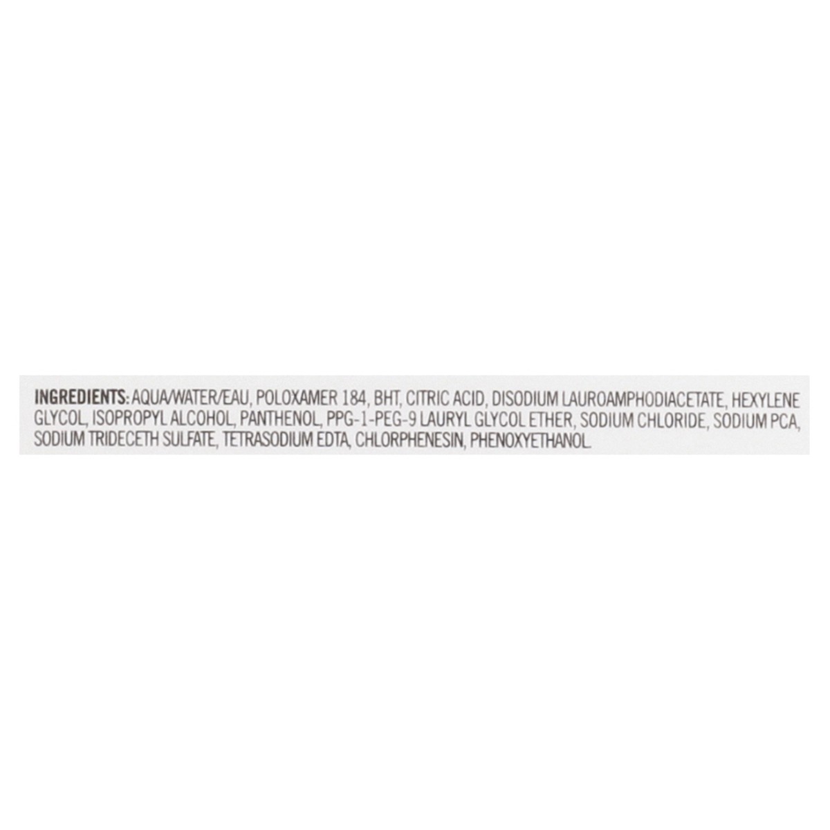 Aqua/Water/Eau, Poloxamer 184, BHT, Citric Acid, Disodium Lauroamphodiacetate, Hexylene Glycol, Isopropyl Alcohol, Panthenol, PPG-1-PEG-9 Lauryl Glycol Ether, Sodium Chloride, Sodium PCA, Sodium Tride…