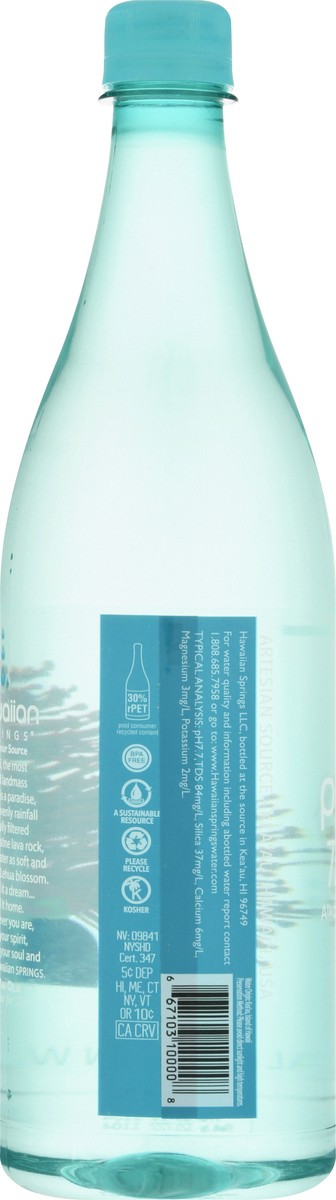 Typical Analysis: pH7.7, TDS 84 mg/l, Silica 37 mg/l, Calcium 6 mg/l, Magnesium 3 mg/l, Potassium 2 mg/l. Ph 7.7 alkaline. Bottled of the source. Hawaiian Springs. Know your source Hawai'i, the most i…