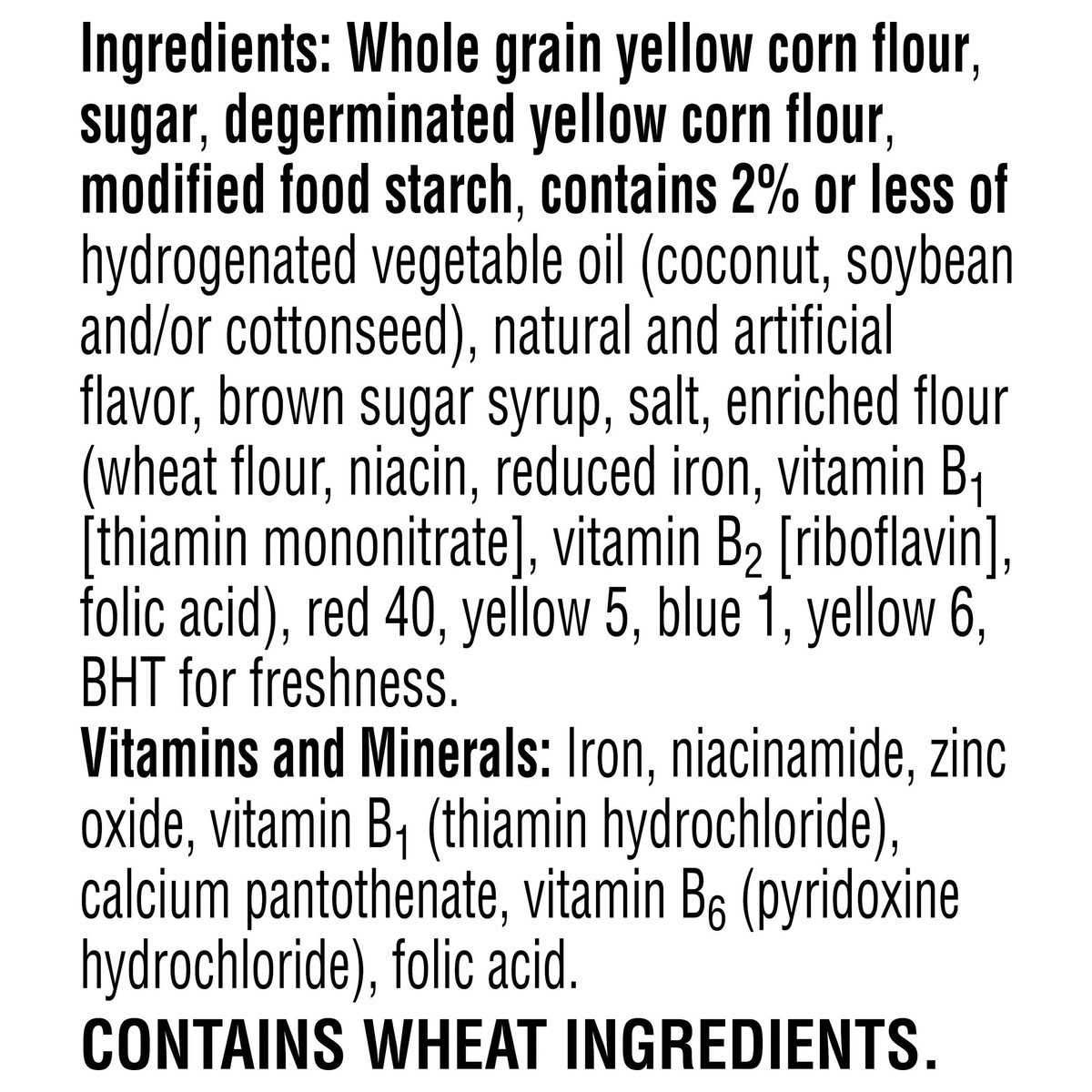 Whole Grain Yellow Corn Flour, Sugar, Degerminated Yellow Corn Flour, Modified Food Starch, Contains 2% or Less of Hydrogenated Vegetable Oil (Coconut, Soybean and/or Cottonseed), Natural and Artifici…