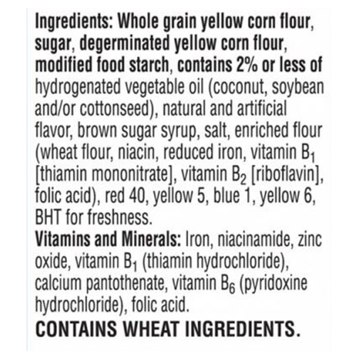 Whole Grain Yellow Corn Flour, Sugar, Degerminated Yellow Corn Flour, Modified Food Starch, Contains 2% or Less of Hydrogenated Vegetable Oil (Coconut, Soybean and/or Cottonseed), Natural and Artifici…
