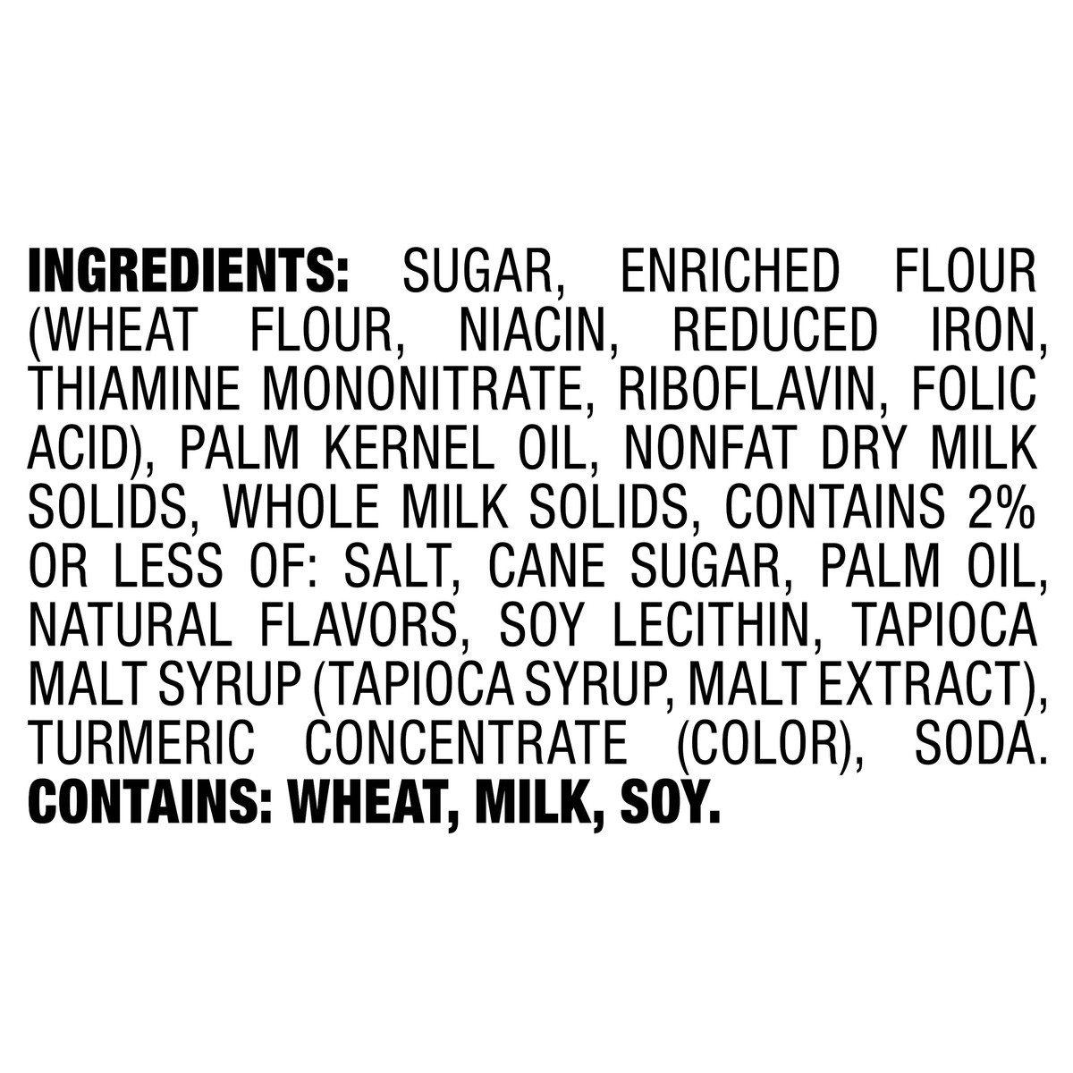 INGREDIENTS: SUGAR, ENRICHED FLOUR (WHEAT FLOUR, NIACIN, REDUCED IRON, THIAMINE MONONITRATE, RIBOFLAVIN, FOLIC ACID), PALM KERNEL OIL, NONFAT DRY MILK SOLIDS, WHOLE MILK SOLIDS, CONTAINS 2% OR LESS OF…