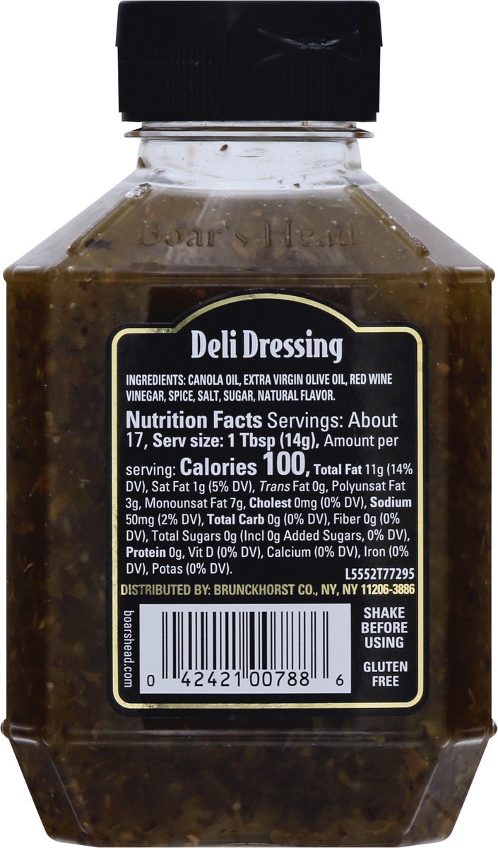 Made with a traditional blend of extra virgin olive oil and red wine vinegar, this tasty sandwich dressing is seasoned to perfection with herbs and spices. Boar's Head Deli Dressing is a flavorful fin…