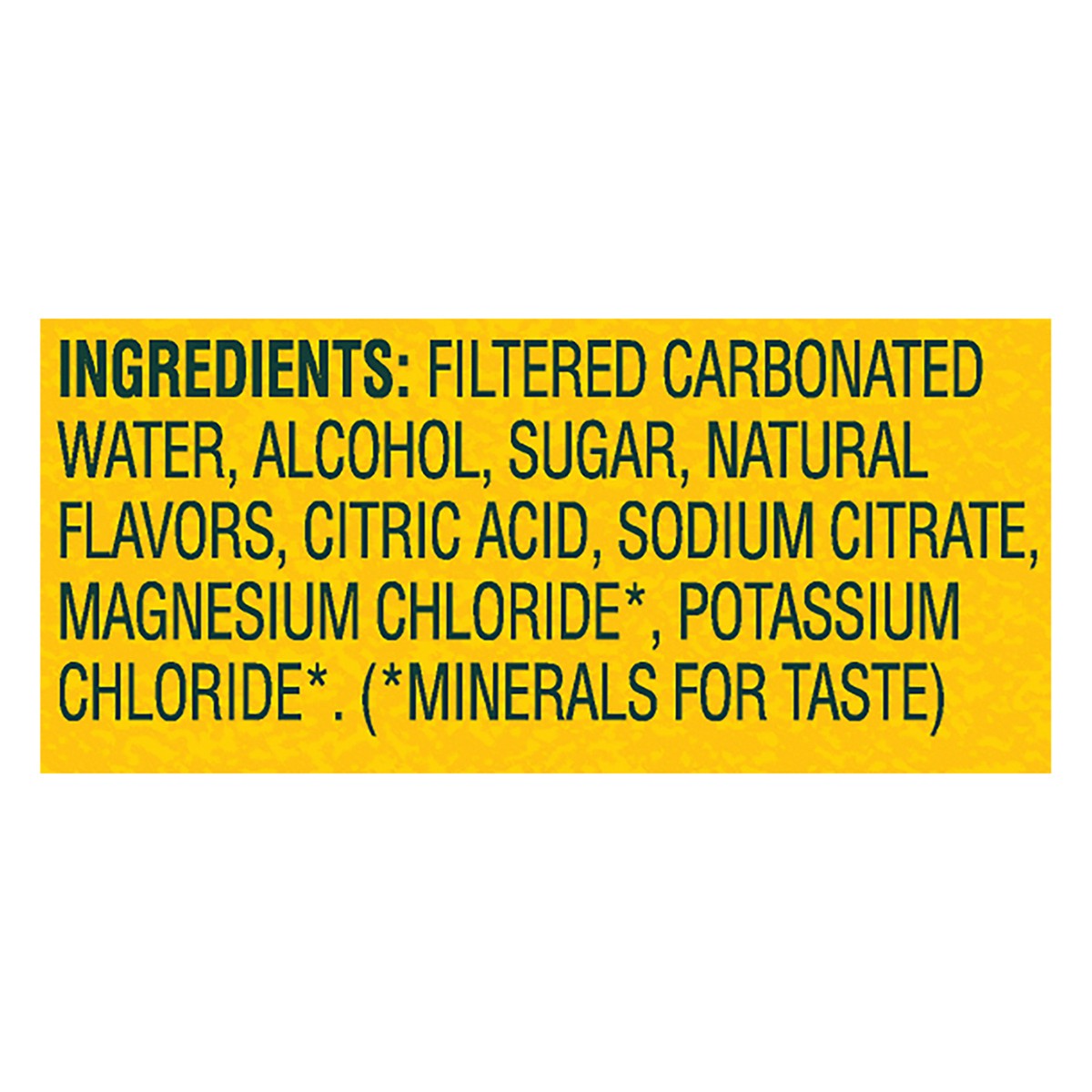 Filtered Carbonated Water, Alcohol, Sugar, Natural Flavors, Citric Acid, Sodium Citrate, Magnesium Chloride*, Potassium Chloride*. (* Minerals for Taste).