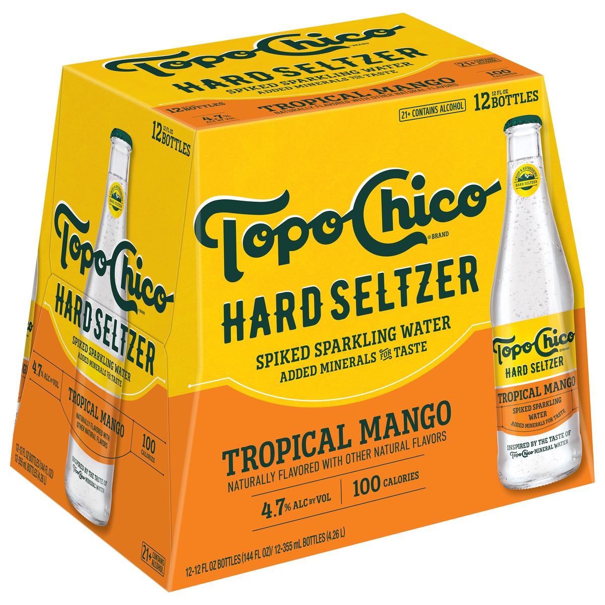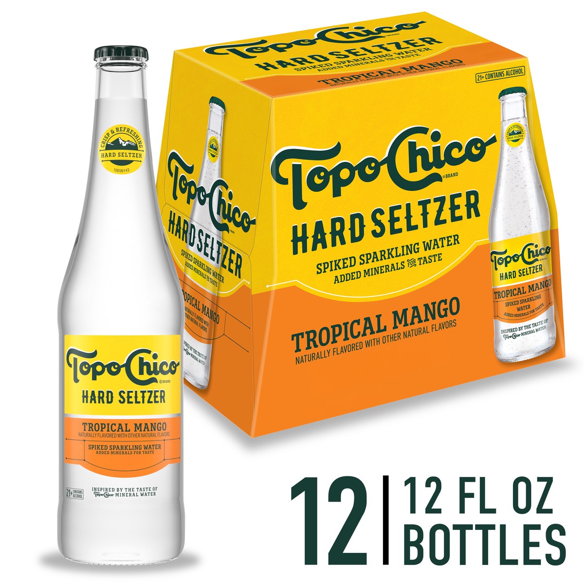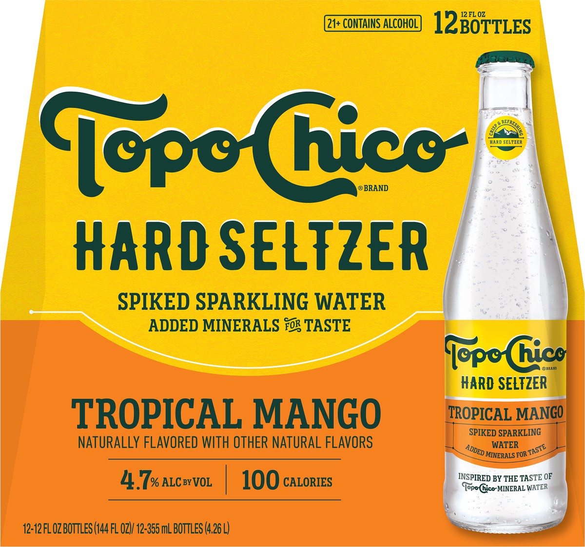 • 12 pack 12.0 fl oz bottles of of Topo Chico Hard Seltzer Tropical Mango FlavorAlcoholic drinks in an iconic glass bottle