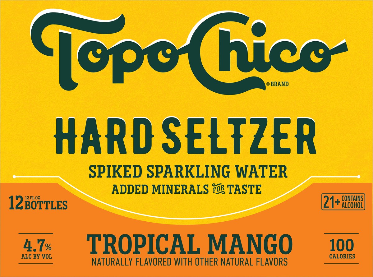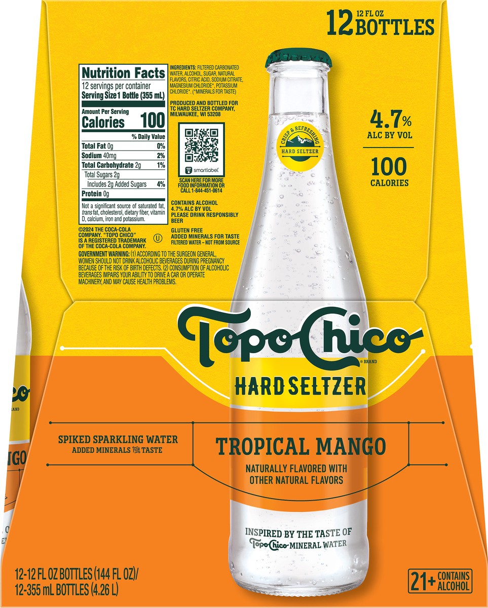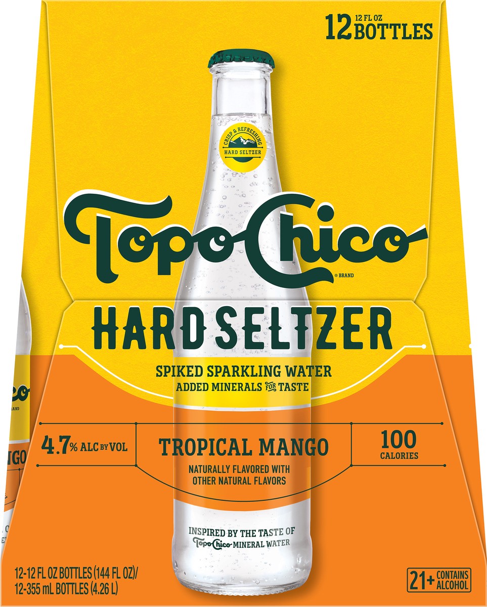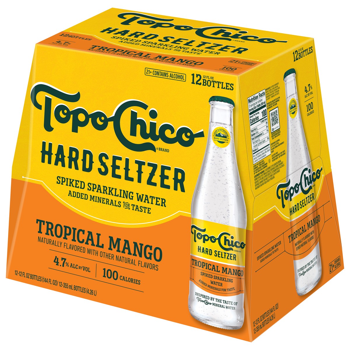 • 12 pack 12.0 fl oz bottles of of Topo Chico Hard Seltzer Tropical Mango FlavorAlcoholic drinks in an iconic glass bottle