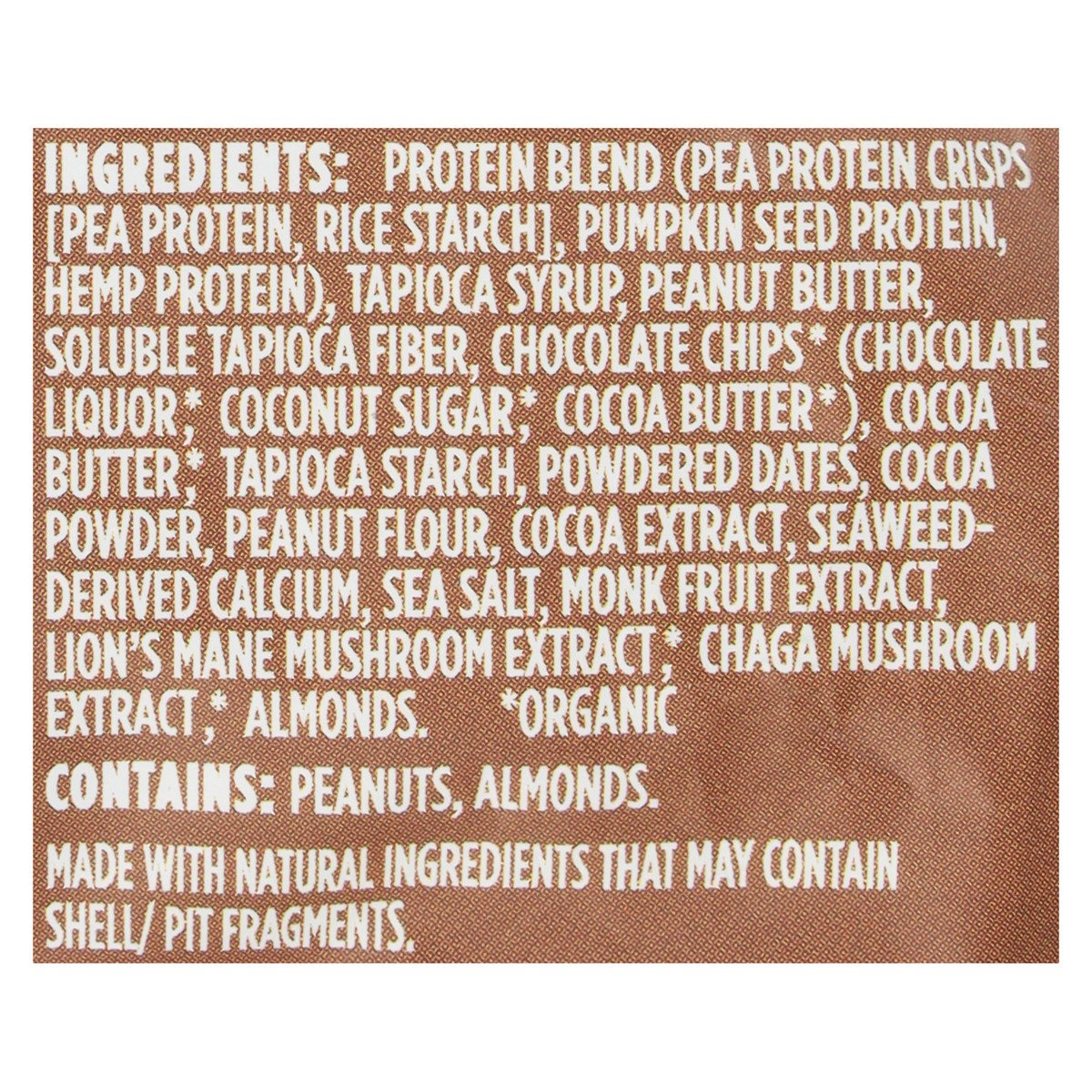 Protein Blend (Pea Protein Crisps [Pea Protein, Rice Starch], Pumpkin Seed Protein, Hemp Protein), Tapioca Syrup, Peanut Butter, Soluble Tapioca Fiber, Chocolate Chips* (Chocolate Liquor*, Coconut Sug…