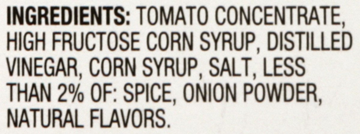 Tomato Concentrate, High Fructose Corn Syrup, Distilled Vinegar, Corn Syrup, Salt, Less than 2% of: Spice, Onion Powder, Natural Flavors.