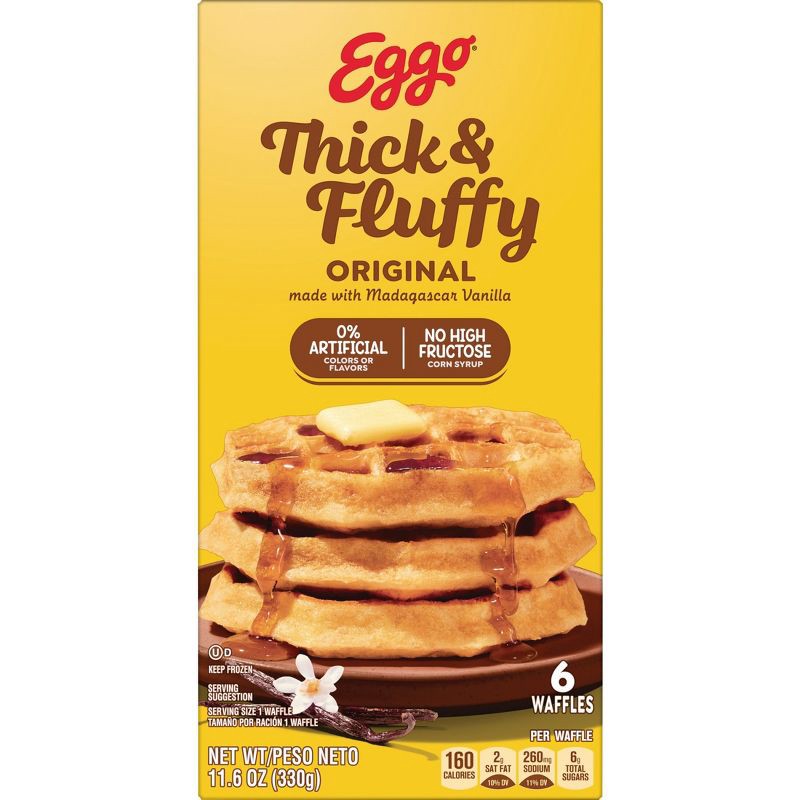 Wake up and greet the day with the feel-good taste of Eggo Thick and Fluffy Original waffles. Crafted with 0% artificial colors or flavors and no high fructose corn syrup, our Belgian-style waffles ar…