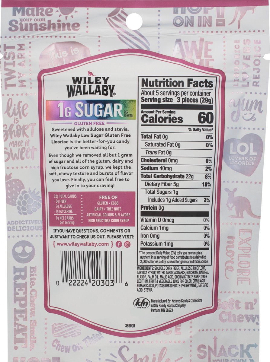 Sweetened with allulose and stevia, Wiley Wallaby Low Sugar, Gluten Free Licorice is the better-for-you candy you’ve been waiting for. Even though we removed all but 1 gram of sugar and all of the glu…