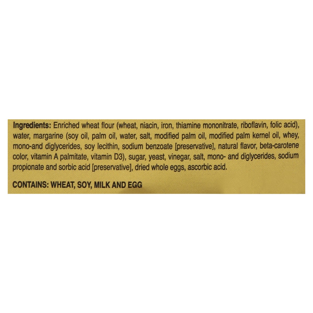 Enriched Wheat Flour (Wheat, Niacin, Iron, Thiamine Mononitrate, Riboflavin, Folic Acid), Water, Margarine (Soy Oil, Palm Oil, Water, Salt, Modified Palm Oil, Modified Palm Kernel Oil, Whey, Mono-and …