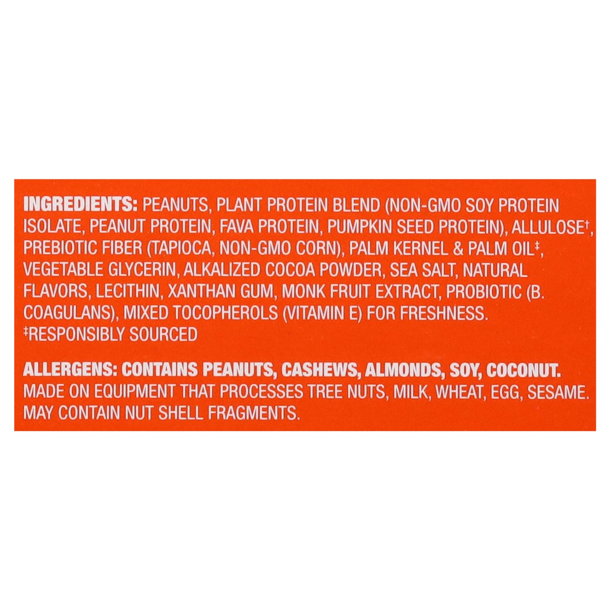 Peanuts, Plant Protein Blend (Non-GMO Soy Protein Isolate, Peanut Protein, Fava Protein, Pumpkin Seed Protein), Allulose(a), Prebiotic Fiber (Tapioca, Non-GMO Corn), Palm Kernel & Palm Oil(B), Vegetab…