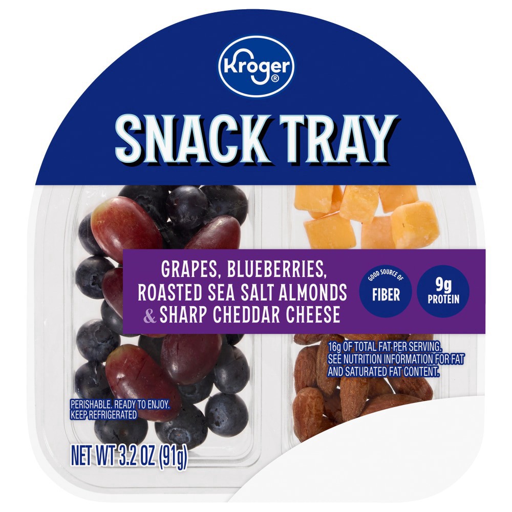 Kroger® Grapes Blueberries Sea Salt Almonds and Sharp Cheddar Snack Tray is full of delicious, ready-to-enjoy treats! Containing delectable grapes, sweet blueberries, and tasty roasted sea salt almond…
