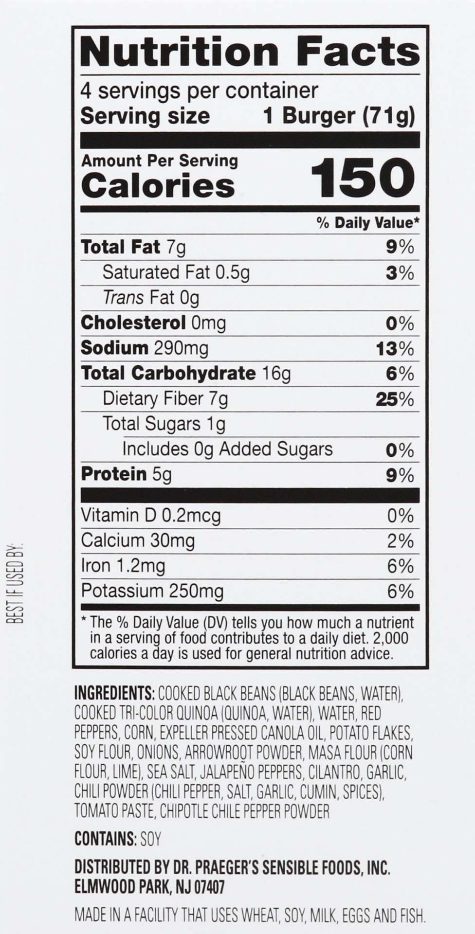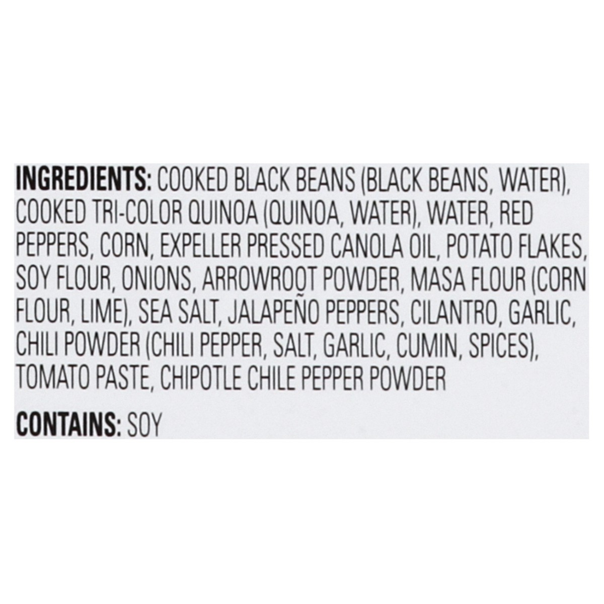 Cooked Black Beans (Black Beans, Water), Cooked Tri-Color Quinoa, Water), Water, Red Peppers, Corn, Expeller Pressed Canola Oil, Potato Flakes, Soy Flour, Onions, Arrowroot Powder, Masa Flour (Corn Fl…