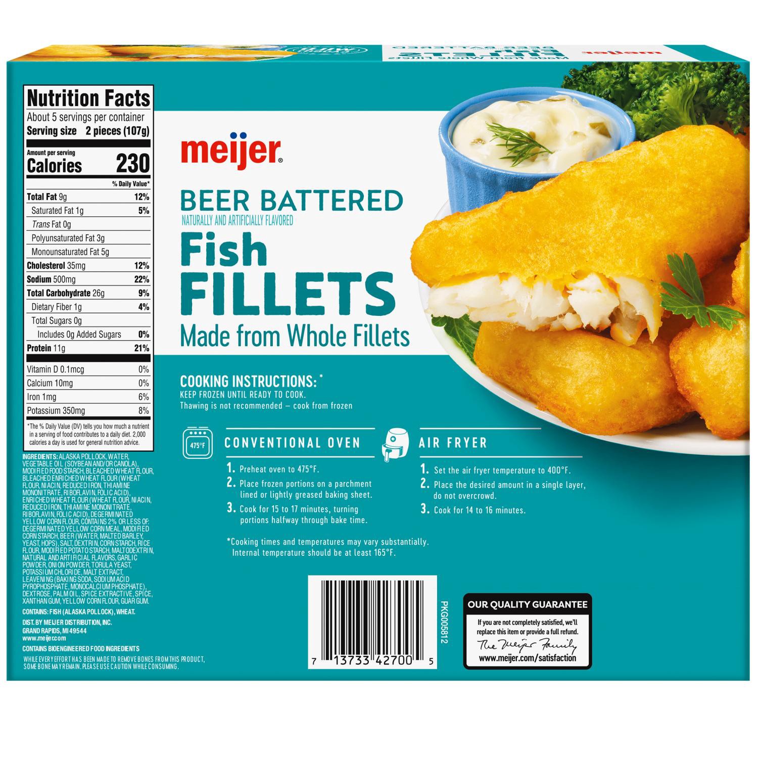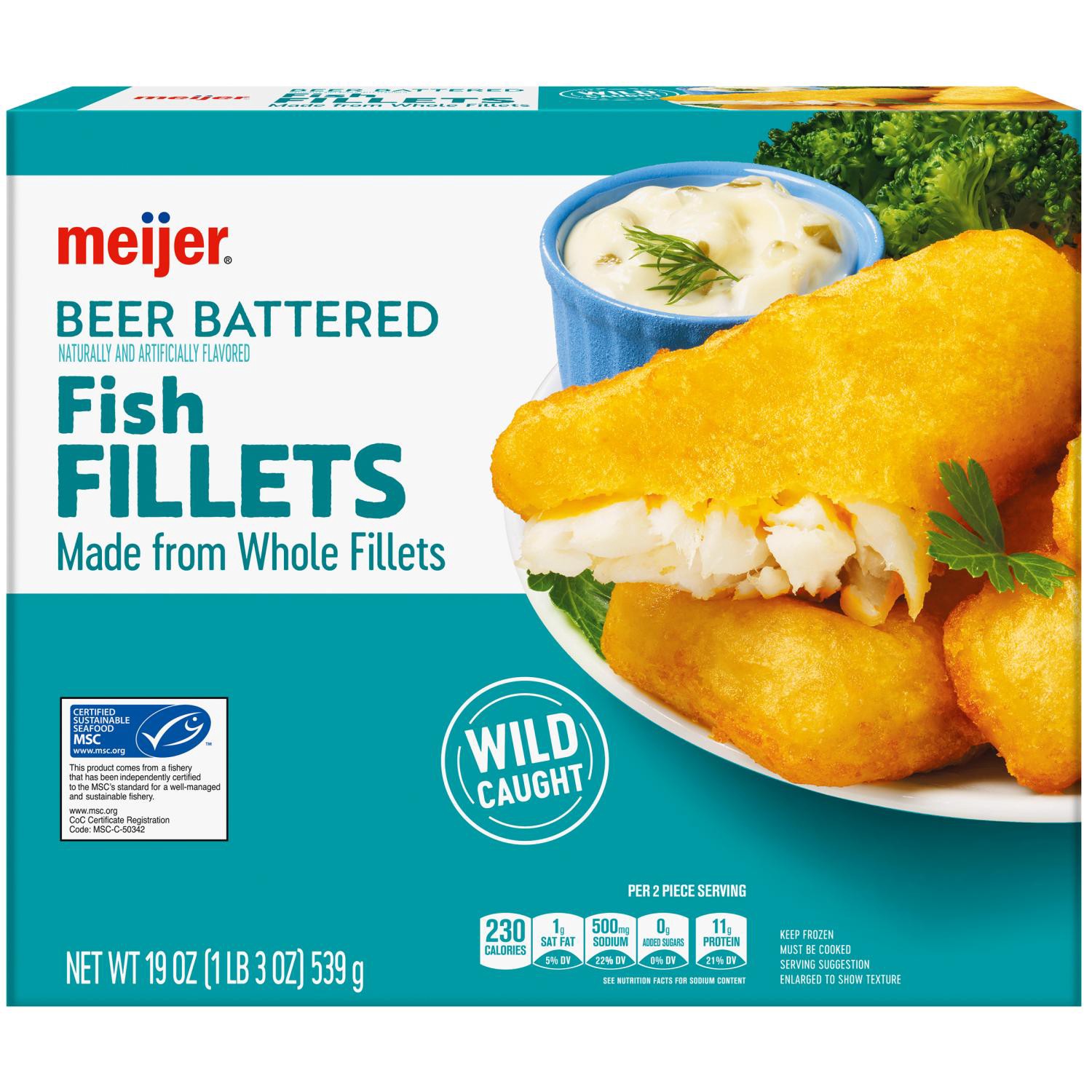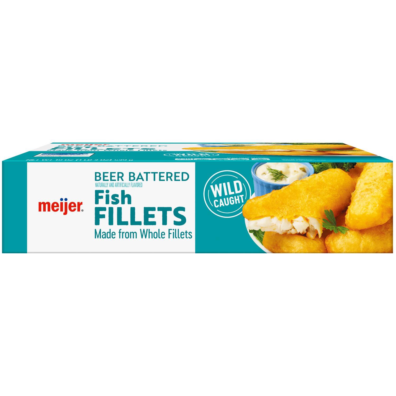 Indulge in the rich flavors of Meijer's Beer Battered Fish Fillets.. These wild-caught fillets, made from whole fish, offer a hearty protein source, making them a perfect addition to your meal.