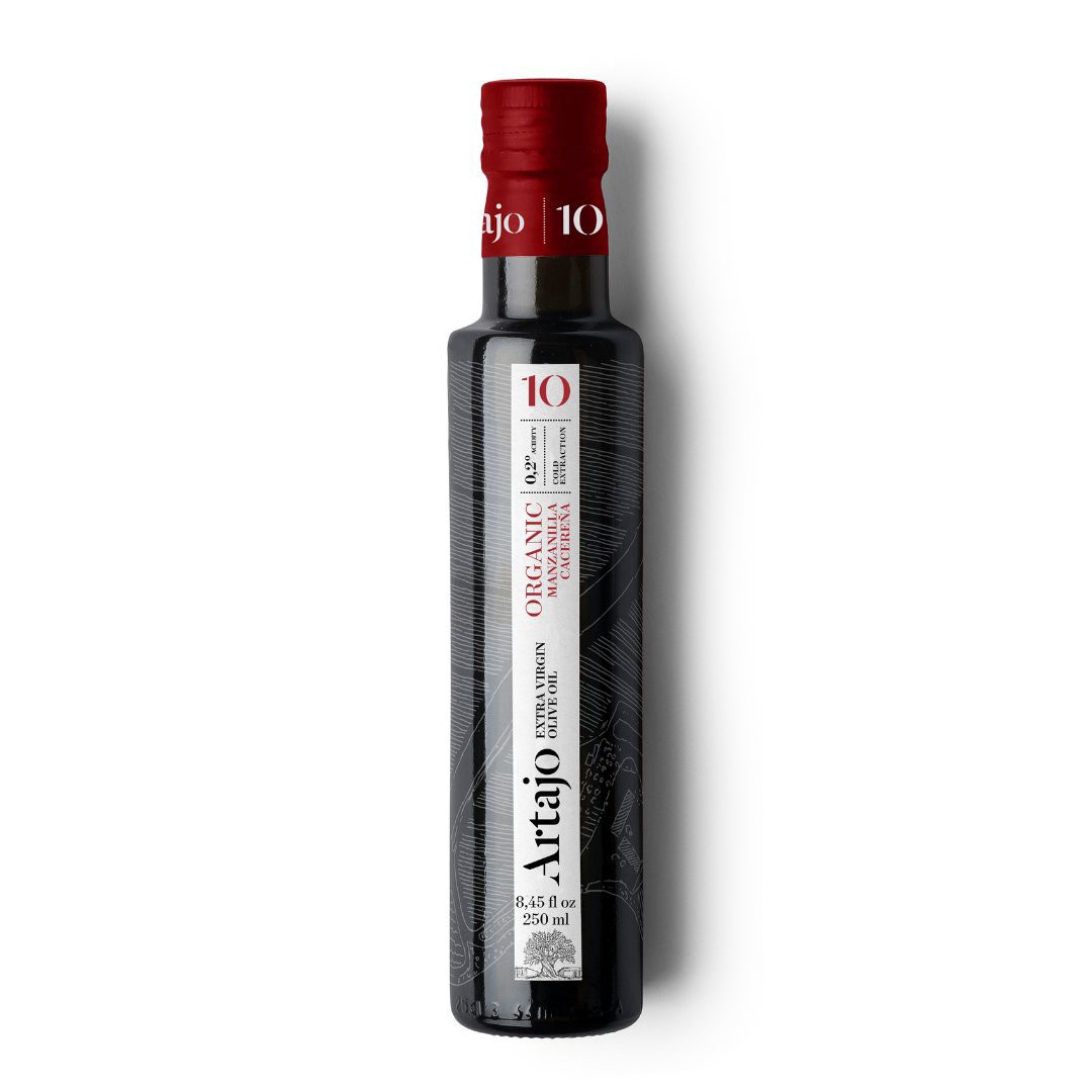 EVOO of the Manzanilla Cacereña variety, made with green olives, from early harvest. Artajo 10 Chamomile, intense and complex EVOO in aroma, where freshly cut grass, sweet fruit (banana) and spices (p…