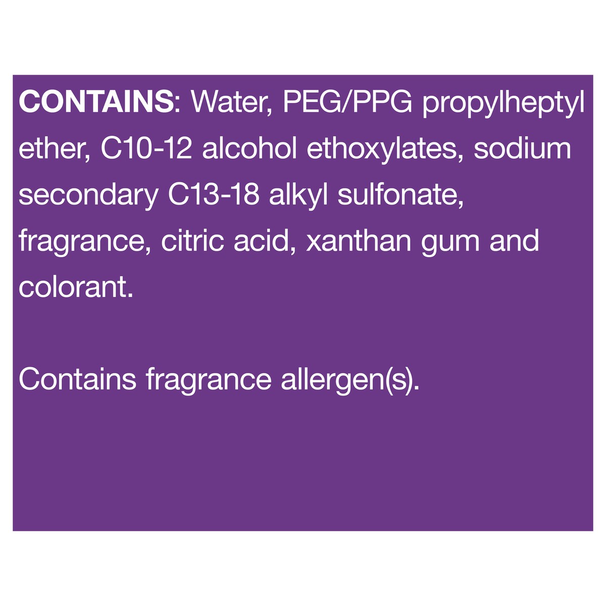 Contains: Water, PEG/PPG Propylheptyl Ether, C10-12 Alcohol Ethoxylates, Sodium Secondary C13-18 Alkyl Sulfonate, Fragrance, Citric Acid, Xanthan Gum and Colorant.