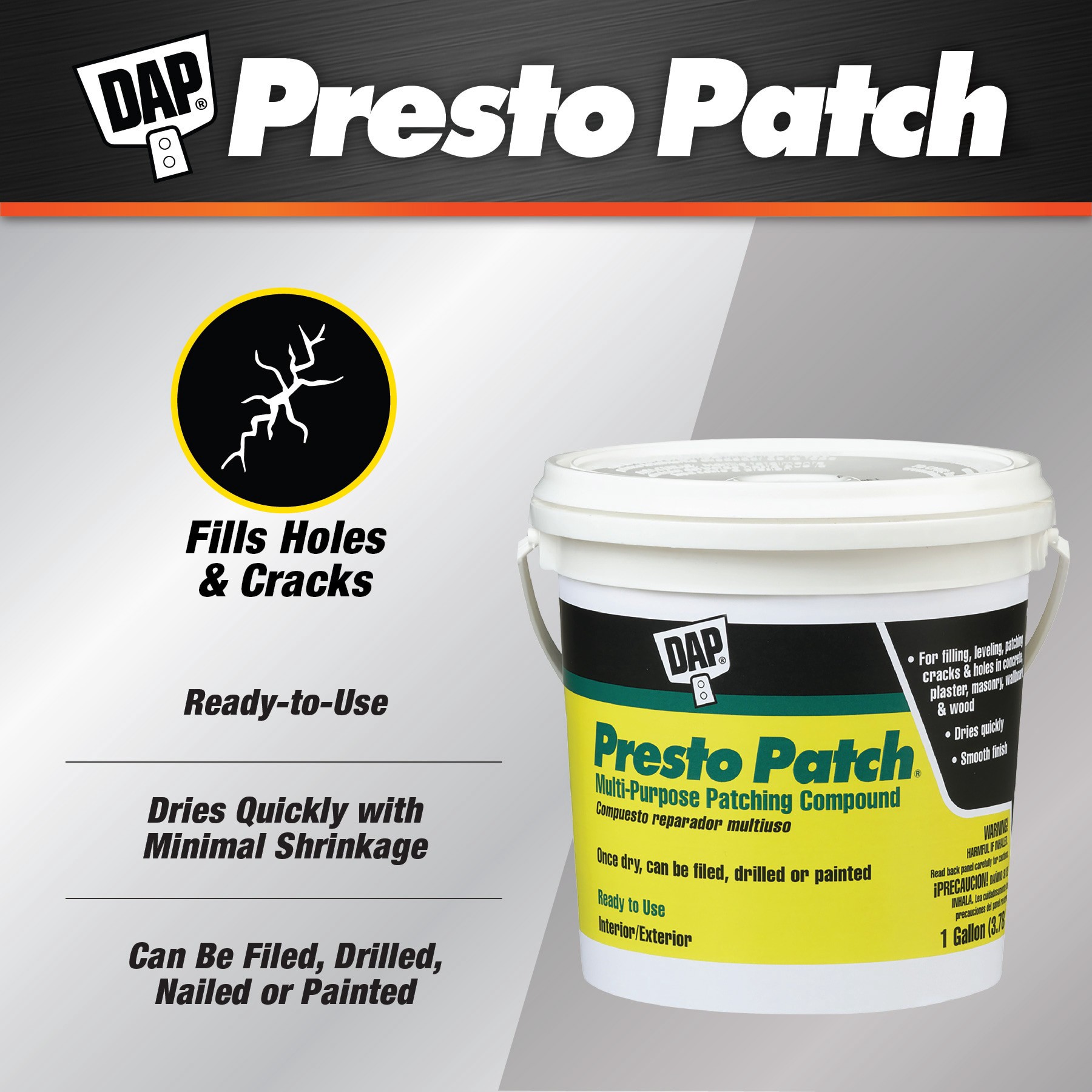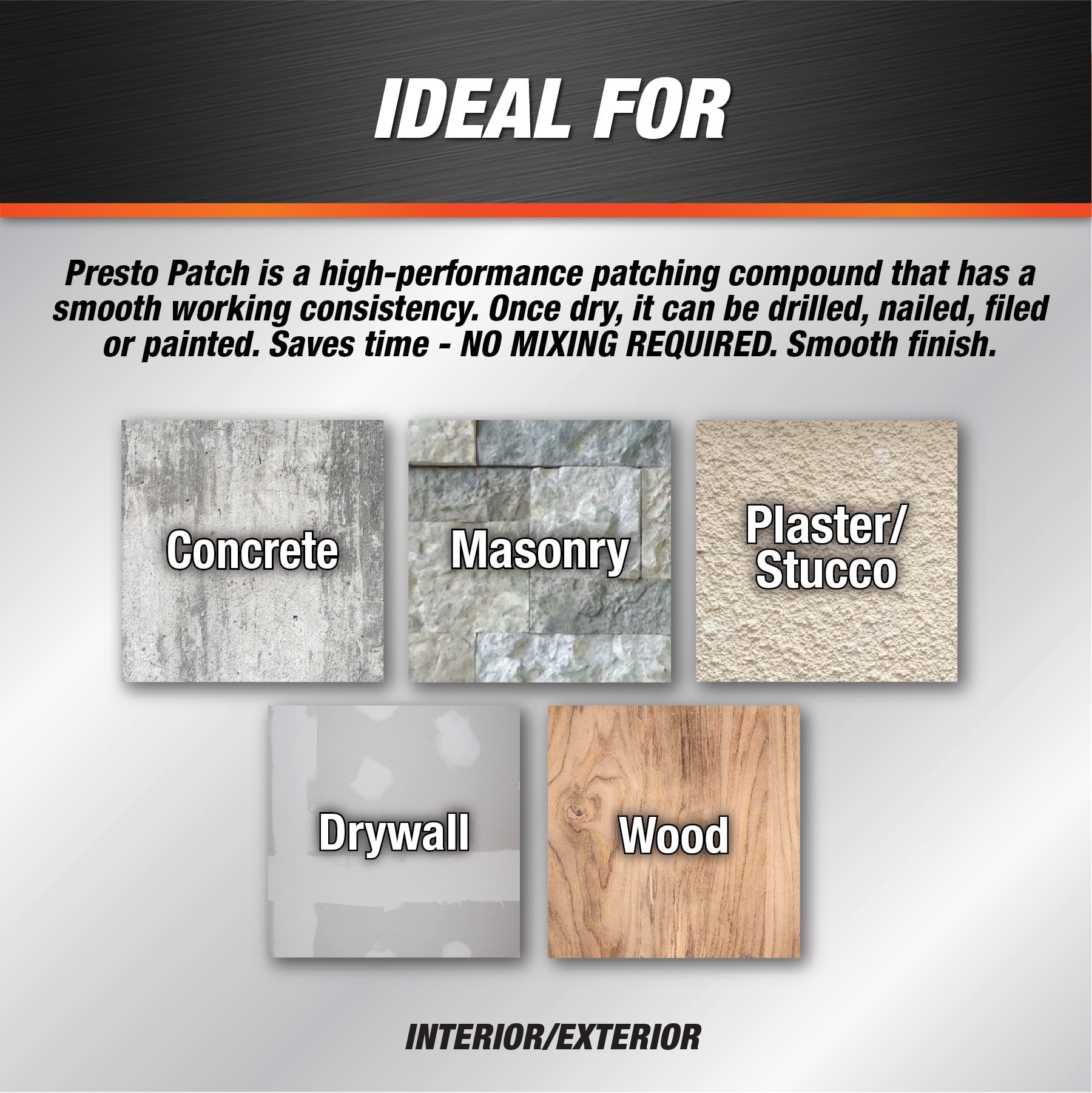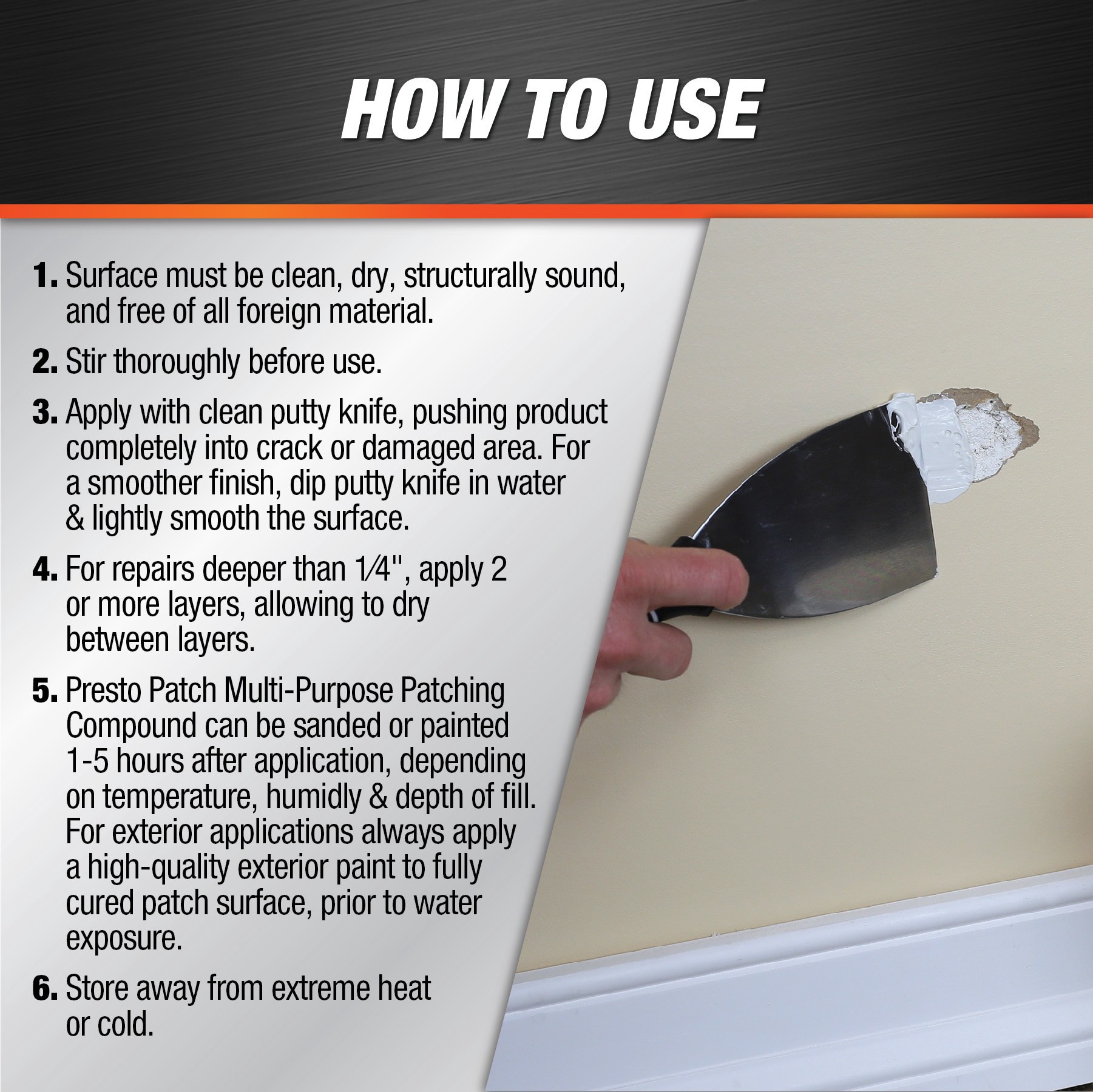 Presto Patch is great for wall repair, ceiling repair and flooring projects. Patch can act as a floor leveler, filler and patch for cracks and holes in concrete, masonry, plaster, wallboard and wood. …