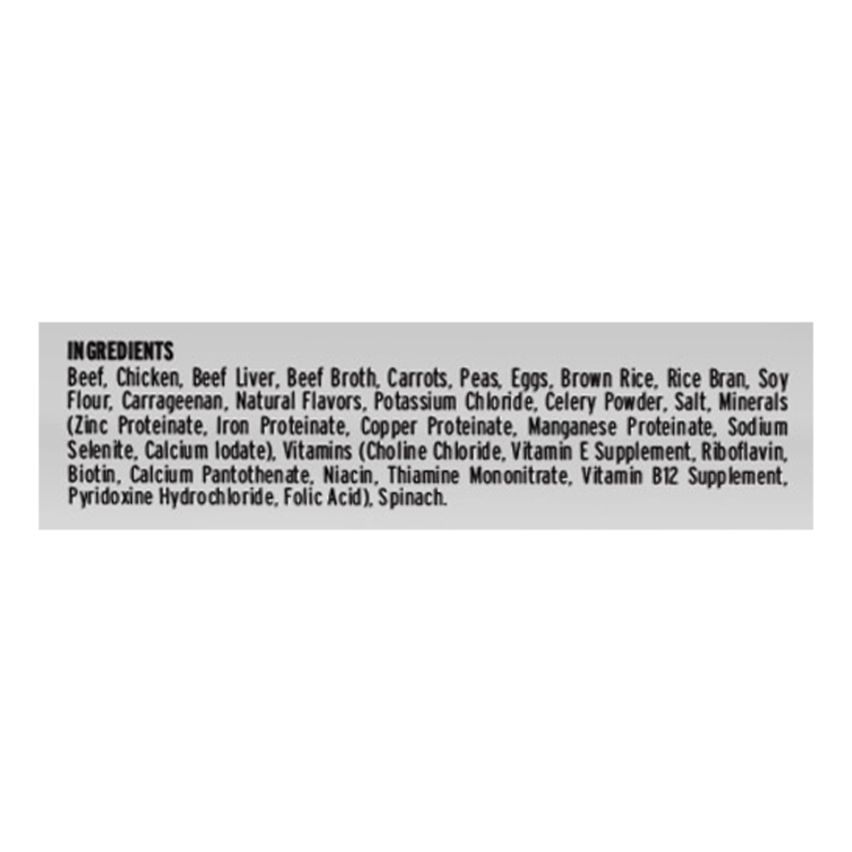 Beef, Chicken, Beef Liver, Beef Broth, Carrots, Peas, Eggs, Brown Rice, Rice Bran, Soy Flour, Carrageenan, Natural Flavors, Potassium Chloride, Celery Powder, Salt, Minerals (Zinc Proteinate, Iron Pro…