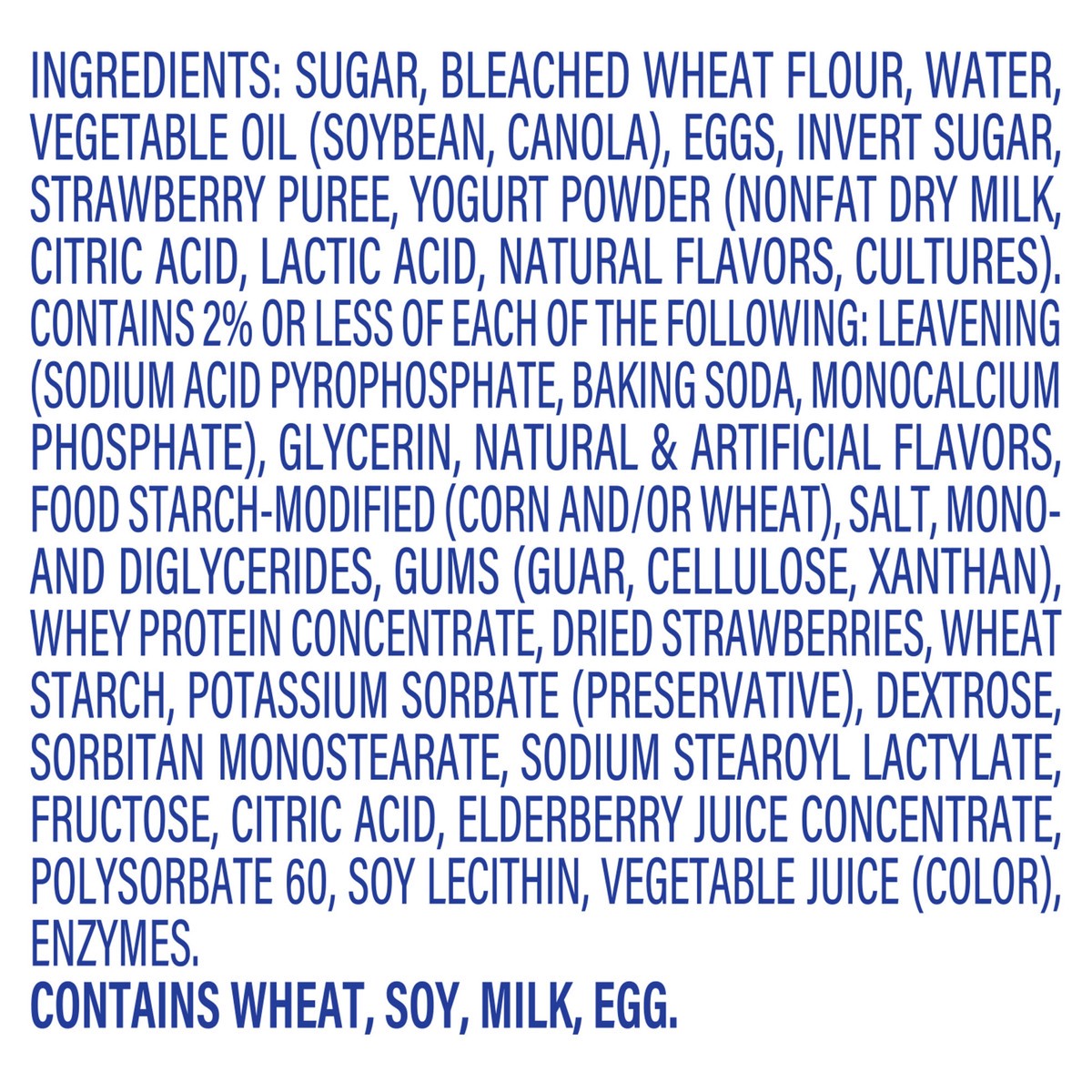 Sugar, Bleached Wheat Flour, Water, Vegetable Oil (Soybean, Canola), Eggs, Invert Sugar, Strawberry Puree, Yogurt Powder [Nonfat Dry Milk, Citric Acid, Lactic Acid, Natural Flavors, Cultures]Contains …