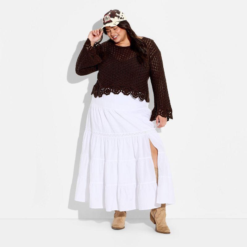 This crochet pullover sweater, made from a fabric blend of cotton, acrylic and recycled cotton, from Wild Fable™ is perfect for all-day comfort. Features a crochet pattern with a floral hem and bell s…