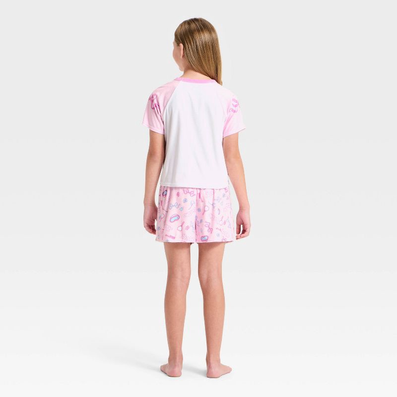 Bring some joy to bedtime with these cute Barbie pajamas. This 2-piece set includes a short sleeve t-shirt with contrast trim and shorts with an elastic waistband for an all-around comfortable fit. Ma…