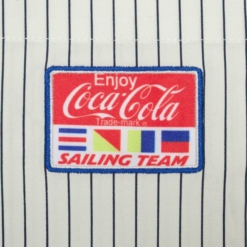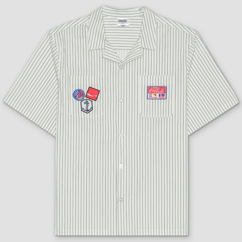 Sail through the day in this Coca-Cola Sailing Workwear Button-Down Shirt. Made of rayon-spandex blend for stretchy comfort, this short-sleeve shirt features blue stripes and patches of Coca-Cola, shi…