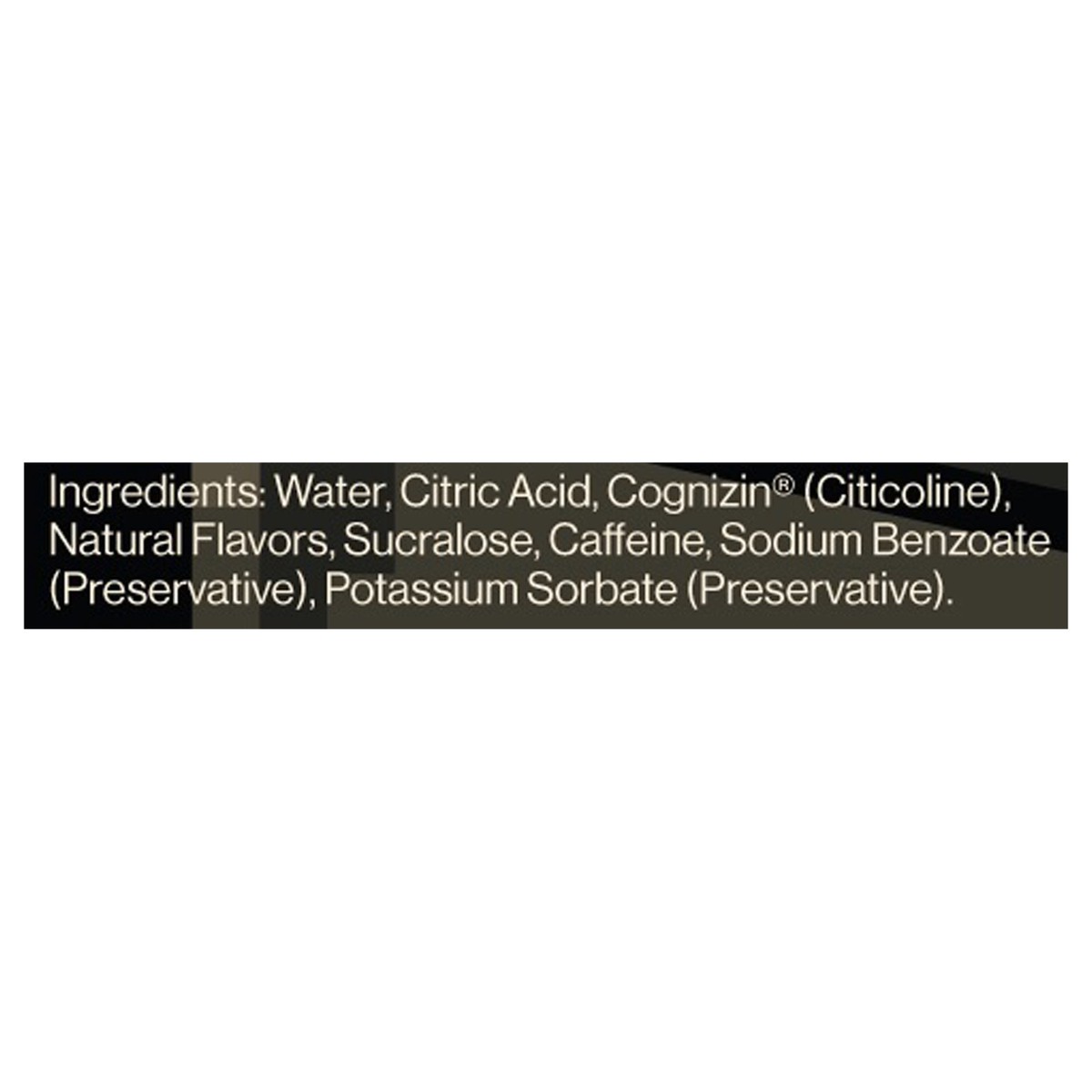 Water, Citric Acid, Cognizin (Citicoline), Natural Flavors, Sucralose, Caffeine, Sodium Benzoate (Preservative), Potassium Sorbate (Preservative).