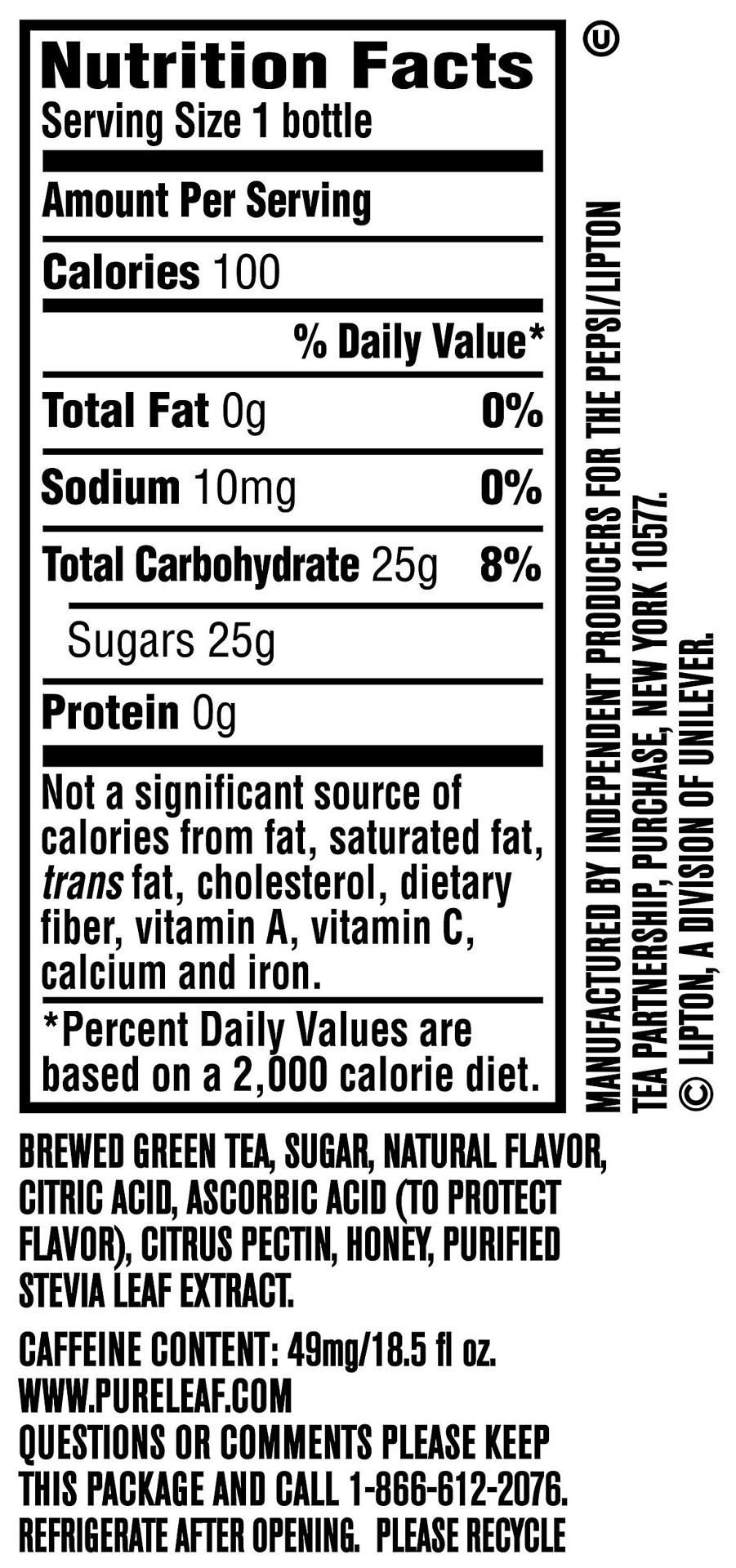 BREWED GREEN TEA, SUGAR, NATURAL FLAVOR, CITRIC ACID, ASCORBIC ACID (VITAMIN C), CITRUS PECTIN, PURIFIED STEVIA LEAF EXTRACT, HONEY.