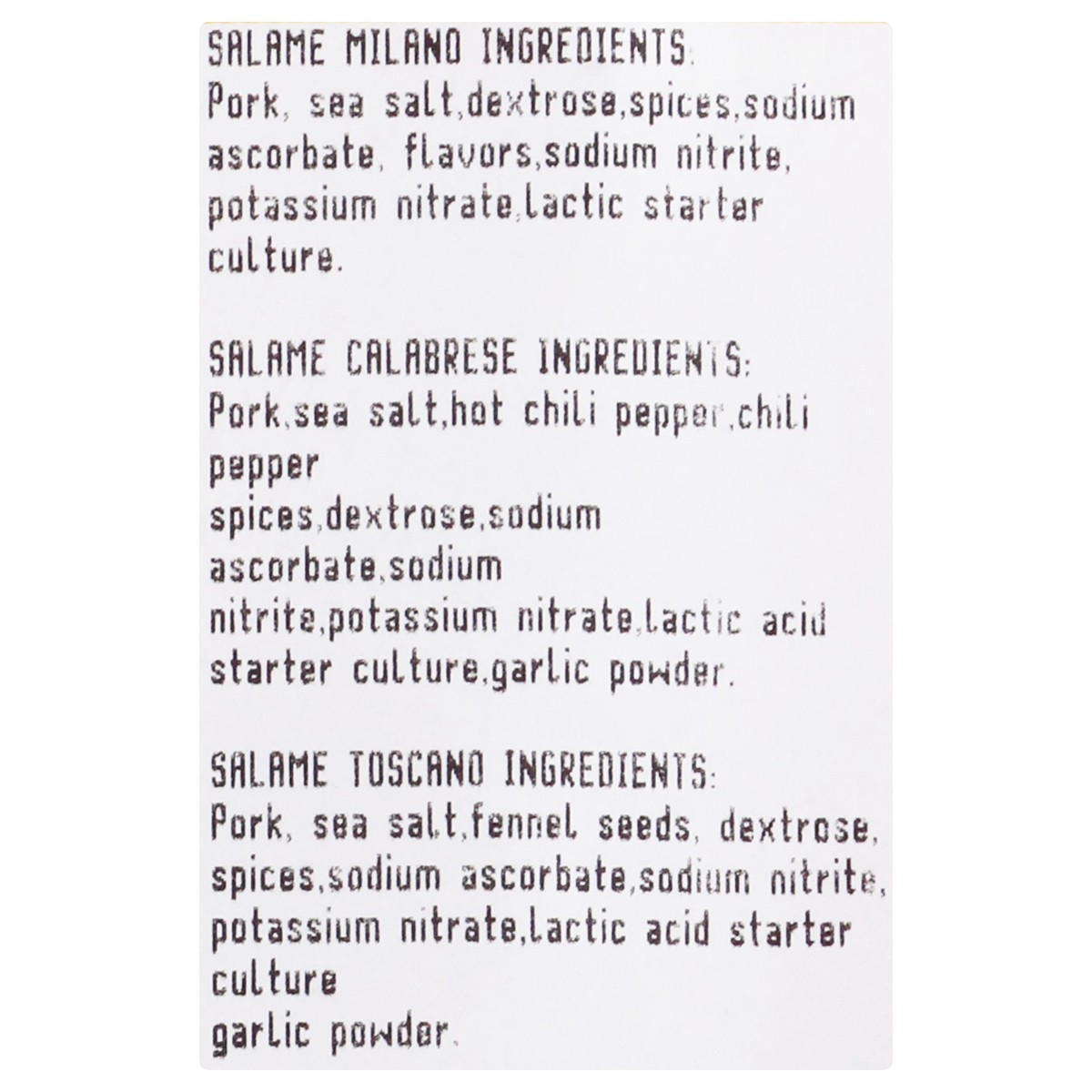 Salame Milano Ingredients: Pork, Sea Salt, Dextrose, Spices, Sodium Ascorbate, Flavors, Sodium Nitrite, Potassium Nitrate, Lactic Starter Culture. Salame Calabrese Ingredients: Pork, Sea Salt, Hot Chi…