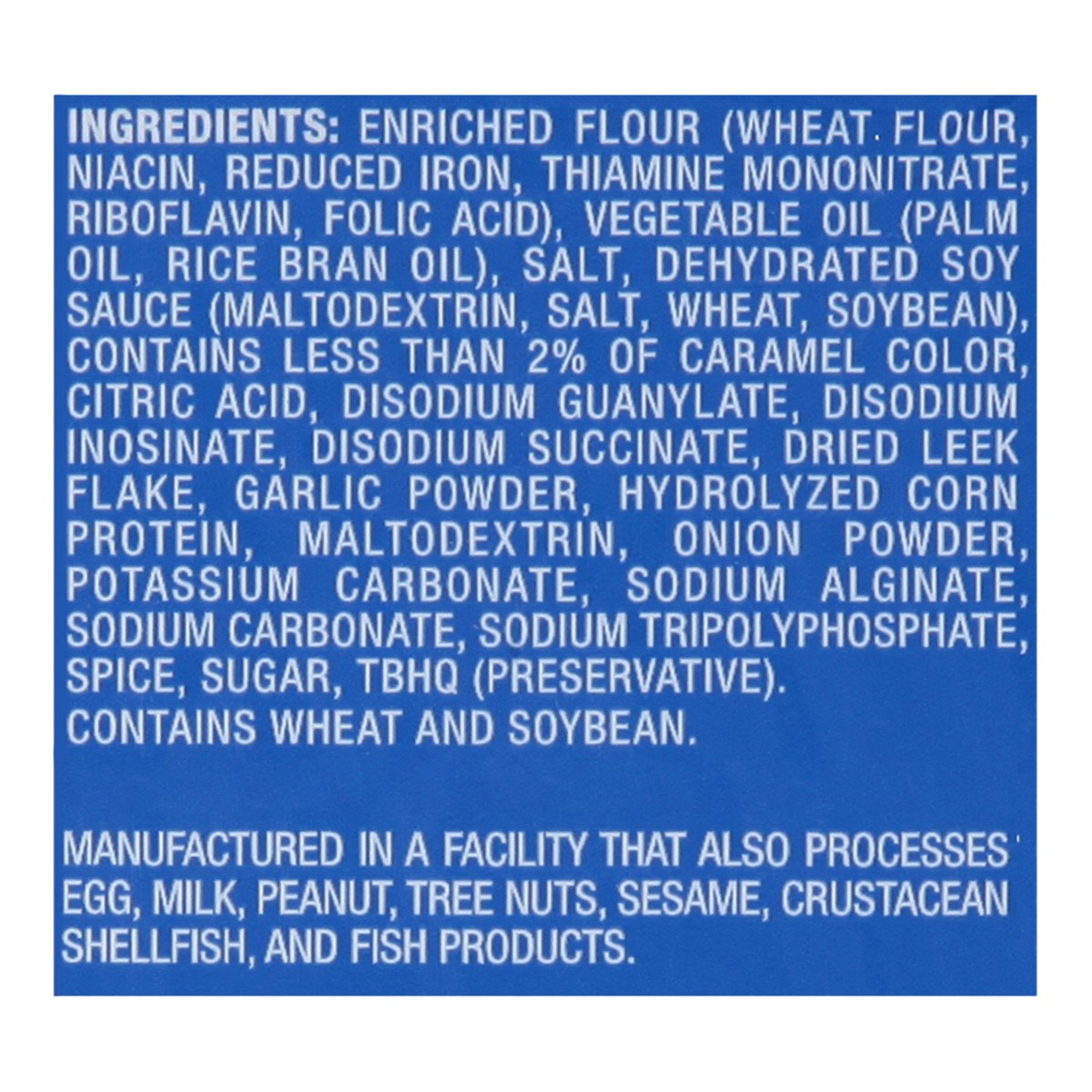 Enriched Flour (Wheat Flour, Niacin, Reduced Iron, Thiamine Mononitrate, Riboflavin, Folic Acid), Vegetable Oil (Palm Oil, Rice Bran Oil), Salt, Dehydrated Soy Sauce (Maltodextrin, Salt, Wheat, Soybea…