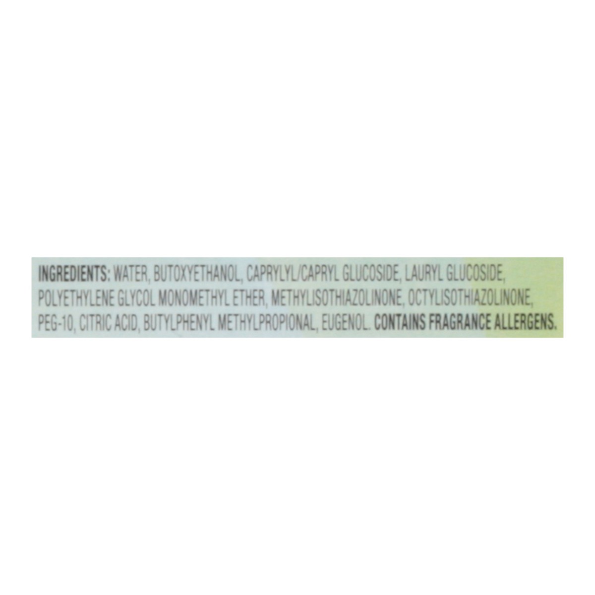 Water, Butoxyethanol, Caprylyl/Capryl Glucoside, Lauryl Glucoside, Polyethylene Glycol Monomethyl Ether, Methylisothiazolinone, Octylisothiazolinone, PEG-10, Citric Acid, Butylphenyl Methylpropional, …
