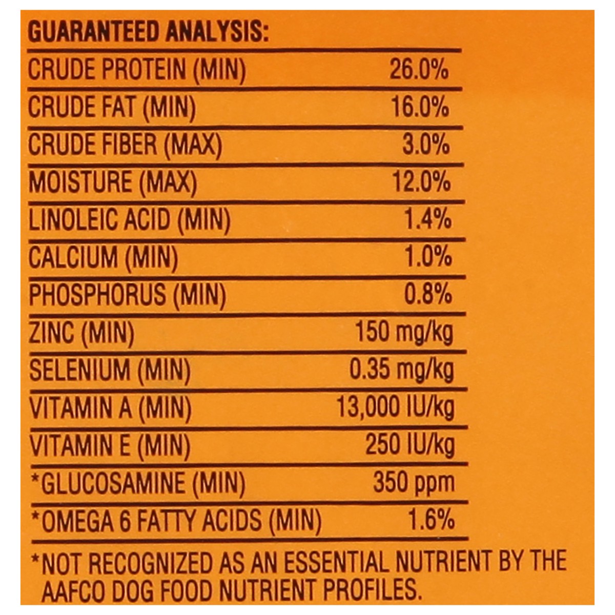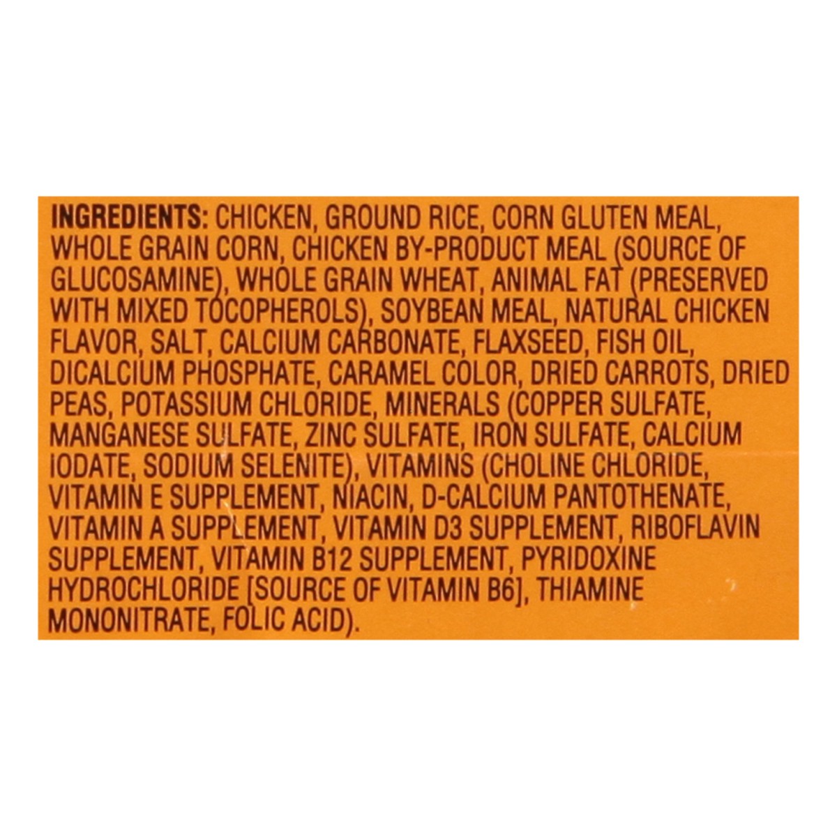 Chicken, Ground Rice, Corn Gluten Meal, Whole Grain Corn, Chicken By-Product Meal (Source of Glucosamine), Whole Grain Wheat, Animal Fat (Preserved with Mixed Tocopherols), Soybean Meal, Natural Chick…