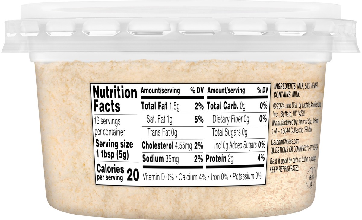 #1 in Italy. Aged over 18 months. Protected designation of origin. GalbaniCheese.com. how2recycle.info. Questions or comments? 1-877-522-8254. Product of Italy.