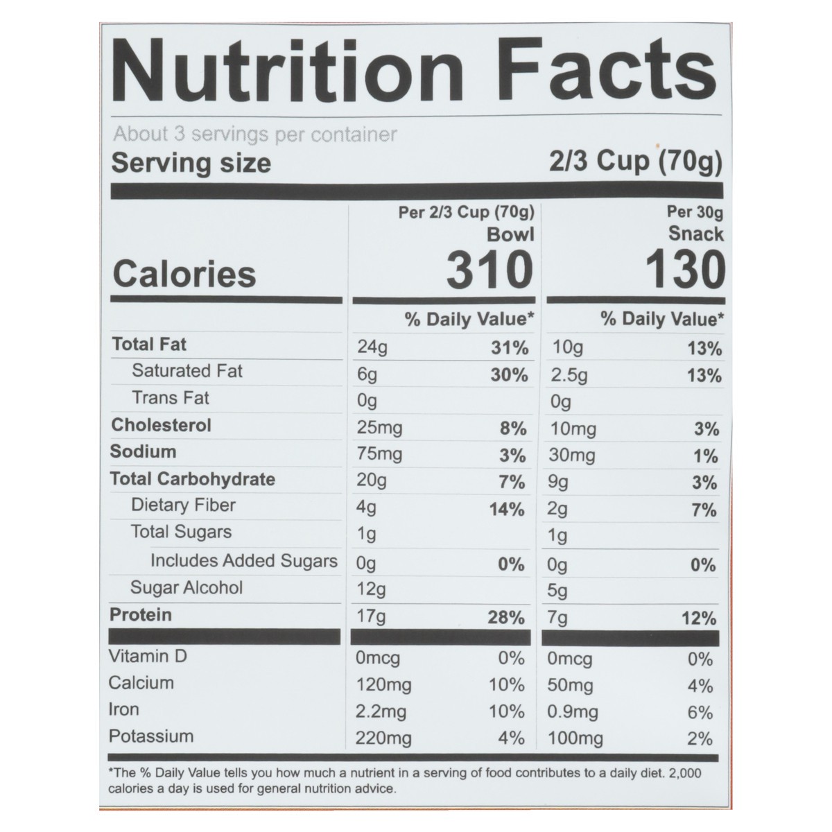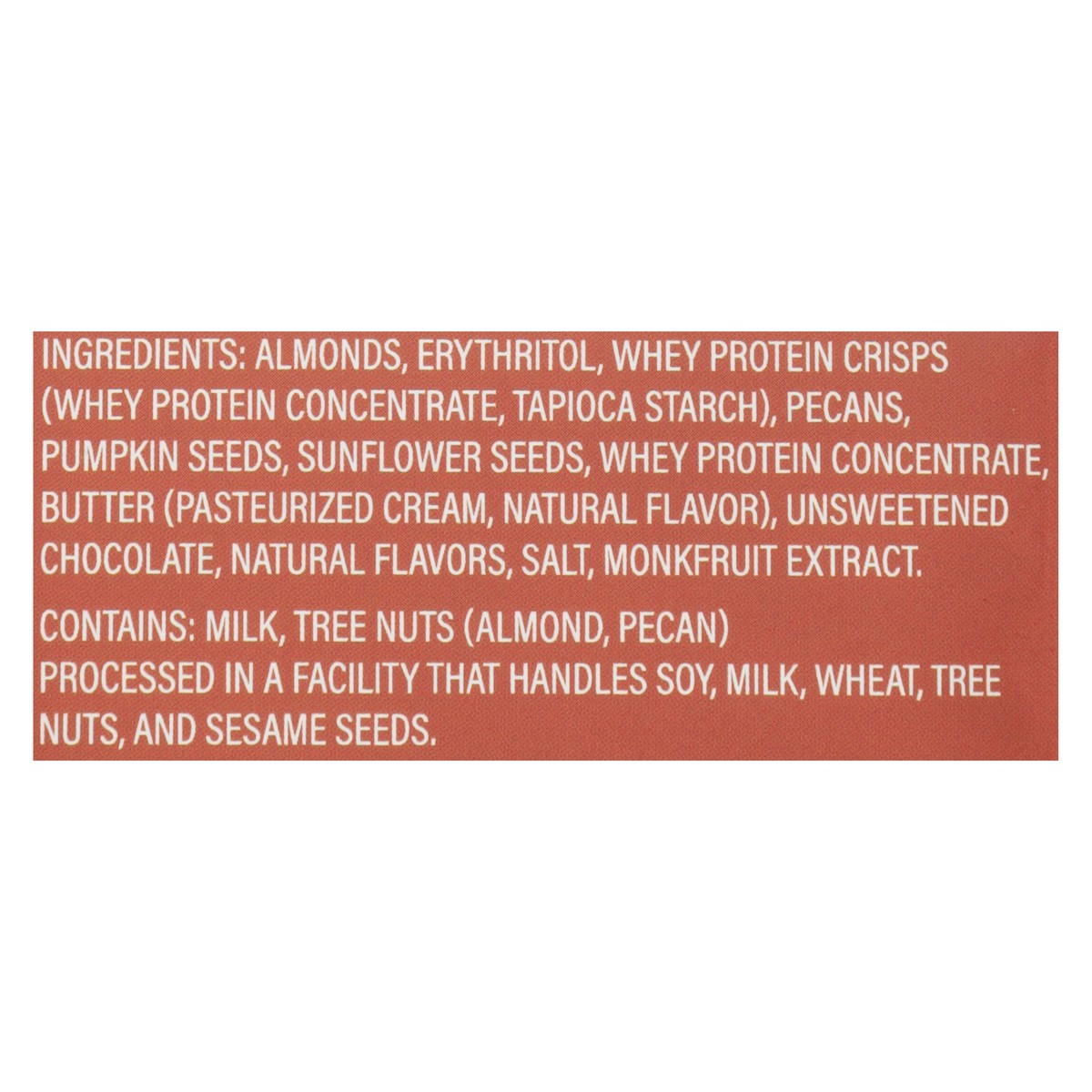 Almonds, Erythritol, Whey Protein Crisps (Whey Protein Concentrate, Tapioca Starch), Pecans, Pumpkin Seeds, Sunflower Seeds, Whey Protein Concentrate, Butter (Pasteurized Cream, Natural Flavor), Unswe…