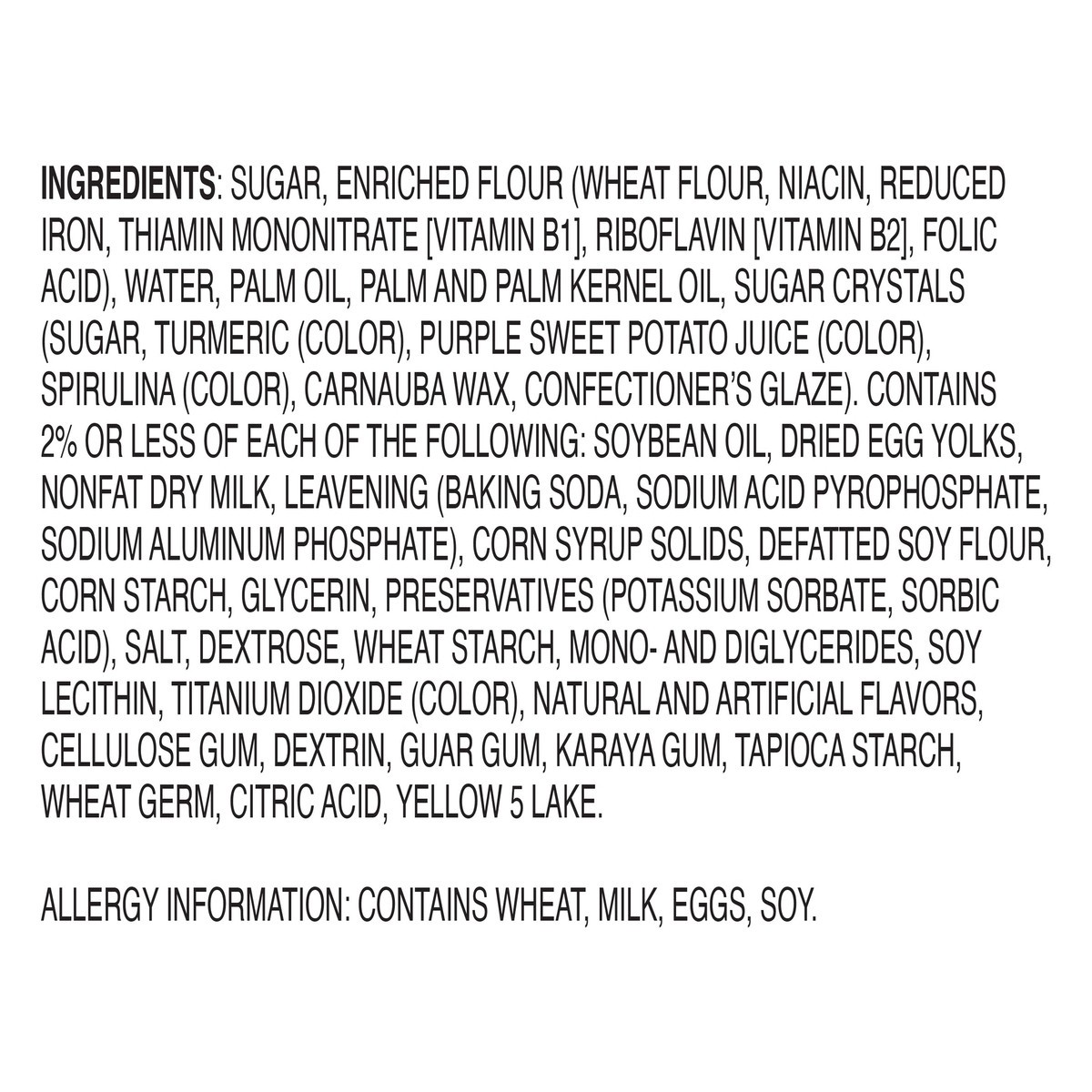 Sugar, Enriched Flour (Wheat Flour, Niacin, Reduced Iron, Thiamin Mononitrate [Vitamin B1], Riboflavin [Vitamin B2], Folic Acid), Water, Palm Oil, Palm and Palm Kernel Oil, Sugar Crystals (Sugar, Turm…
