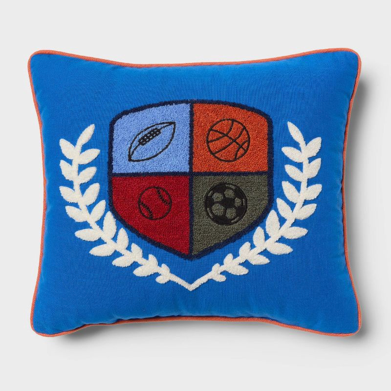 Decorate your kid's space in sporty style with the All Sports Kids' Decorative Throw Pillow from Pillowfort™. This blue throw pillow features a collegiate-style logo with a variety of balls and contra…