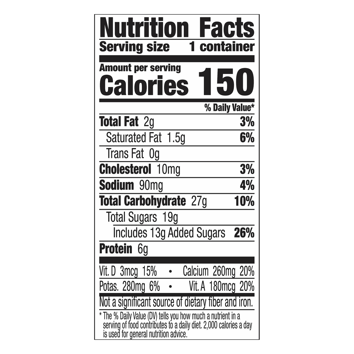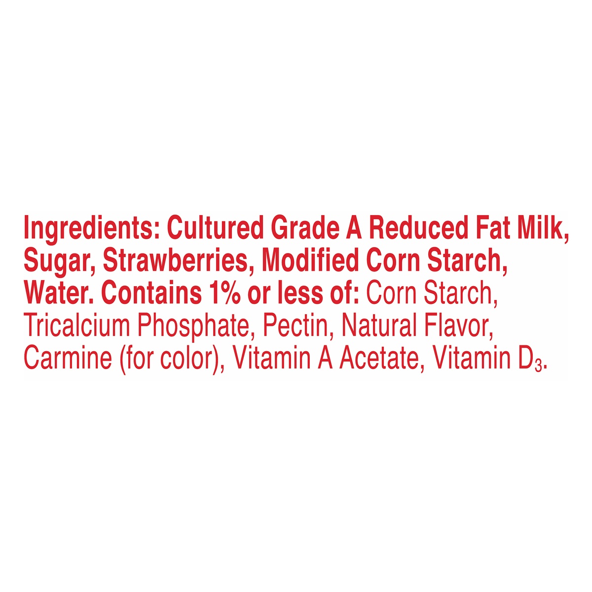 Cultured Grade A Low Fat Milk, Sugar, Strawberries, Modified Food Starch, Water. Contains 1% or Less of: Kosher Gelatin, Corn Starch, Natural Flavor, Carmine (for Color), Pectin, Vitamin A Acetate, Vi…