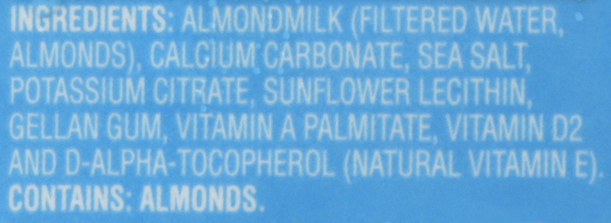 Almond Milk (Filtered Water, Almonds), Calcium Carbonate, Sea Salt, Potassium Citrate, Sunflower Lecithin, Gellan Gum, Vitamin A Palmitate, Vitamin D2 and D-Alpha Tocopherol (Natural Vitamin E).