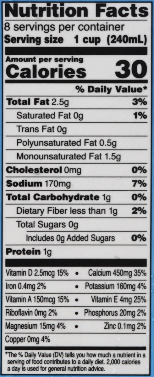 Per 1 Cup Serving: 30 calories; 0 g sat fat (1% DV); 170 mg sodium (7% DV); 0 g total sugars. Carrageenan free; cholesterol free; dairy free; gluten free; soy free; lactose free. Excellent source of c…