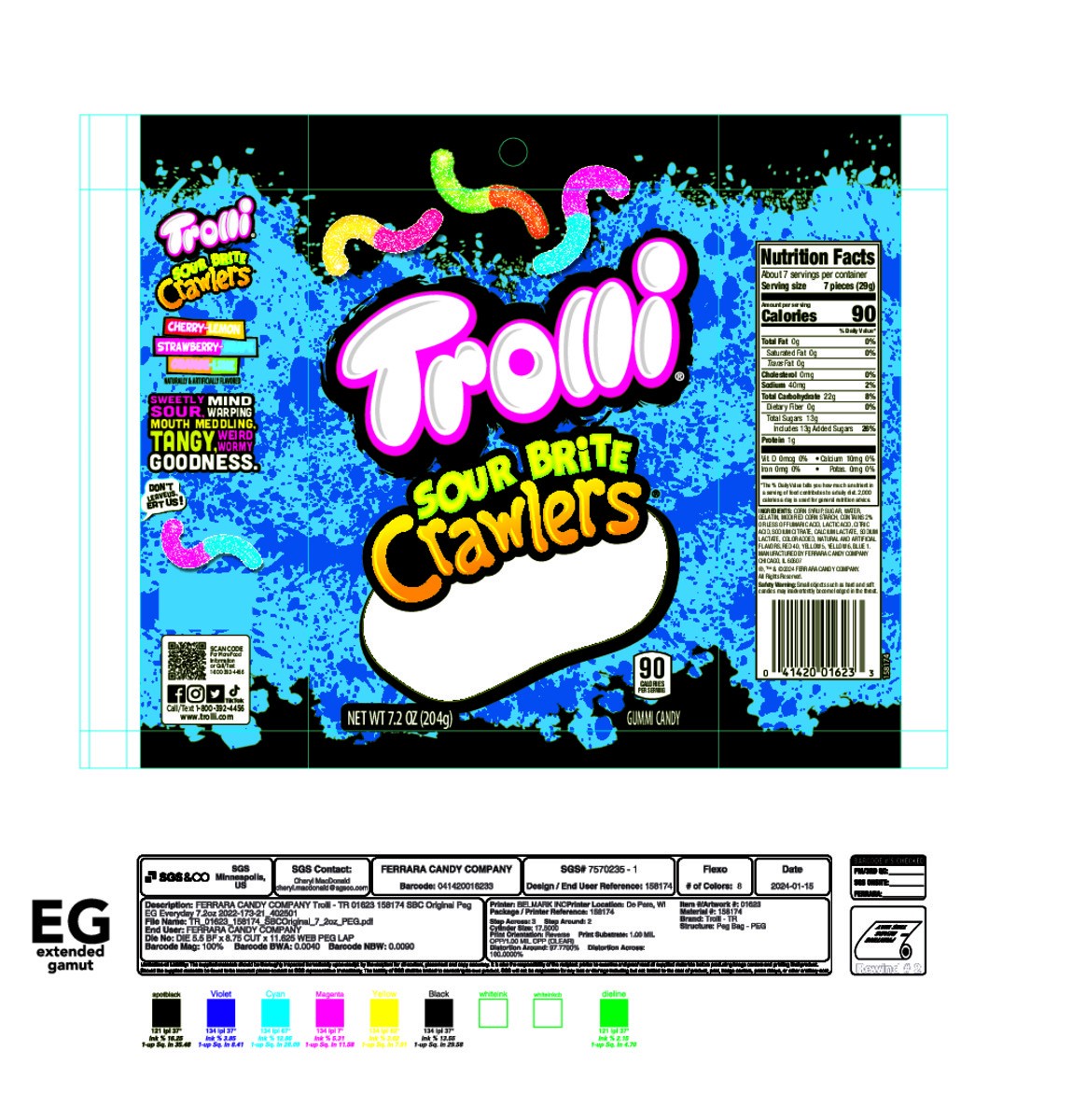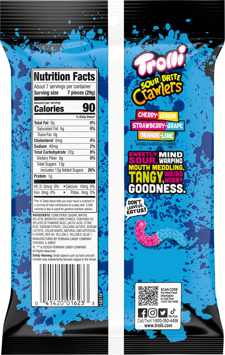It's Trolli! Trolli Sour Brite Crawlers 7.2 oz Bag are multi-flavored gummy worms covered in a tongue-twisting sugary goodness, striking the perfect balance of sweet and sour in every bite. Trolli sou…