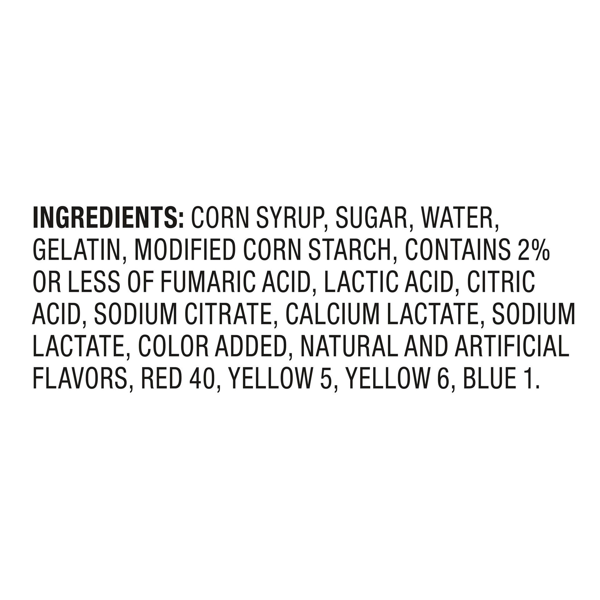 Corn Syrup, Sugar, Water, Gelatin, Modified Corn Starch, Contains 2% or Less of Fumaric Acid, Lactic Acid, Citric Acid, Sodium Citrate, Calcium Lactate, Sodium Lactate, Color Added, Natural and Artifi…
